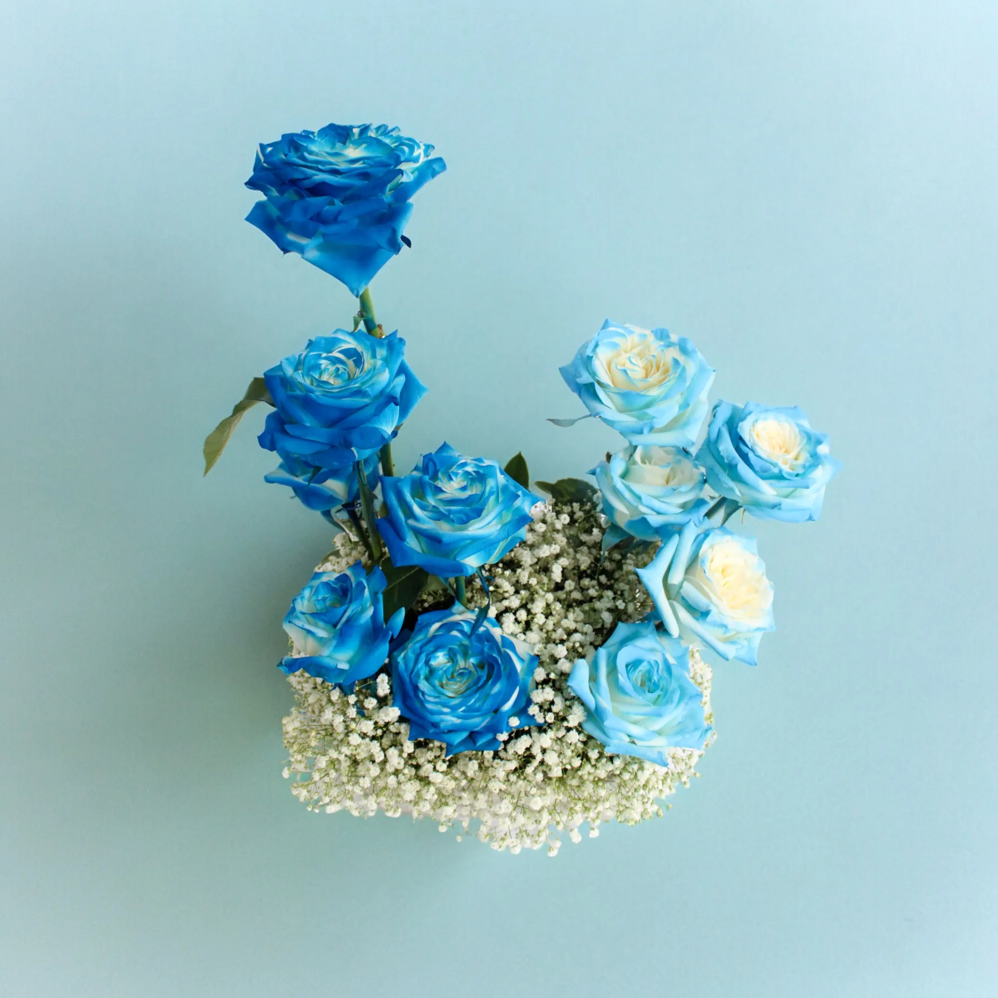 Hermoso arreglo elaborado con Rosas tinturadas azules y Gipsofilia en base cuadrada.