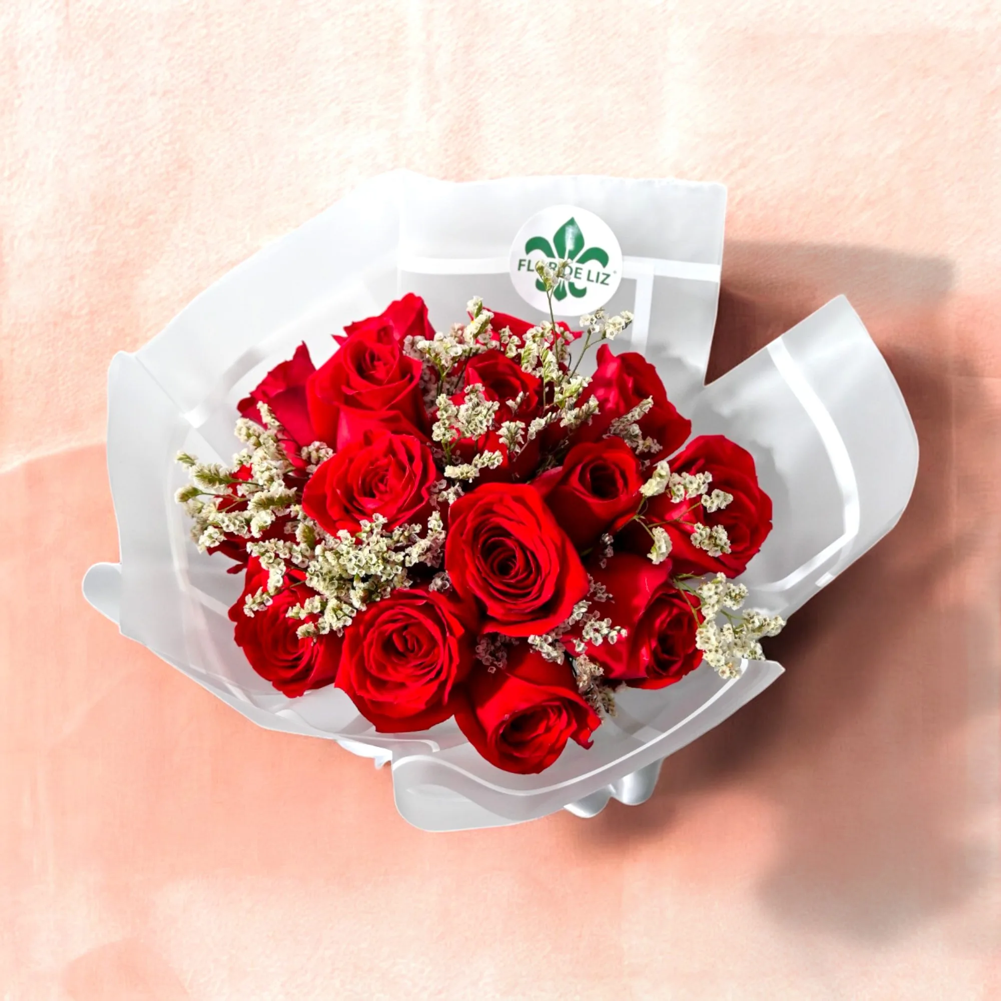 Sutil y encantador, este ramillete con rosas y gipsofilia es pura expresión de cariño.