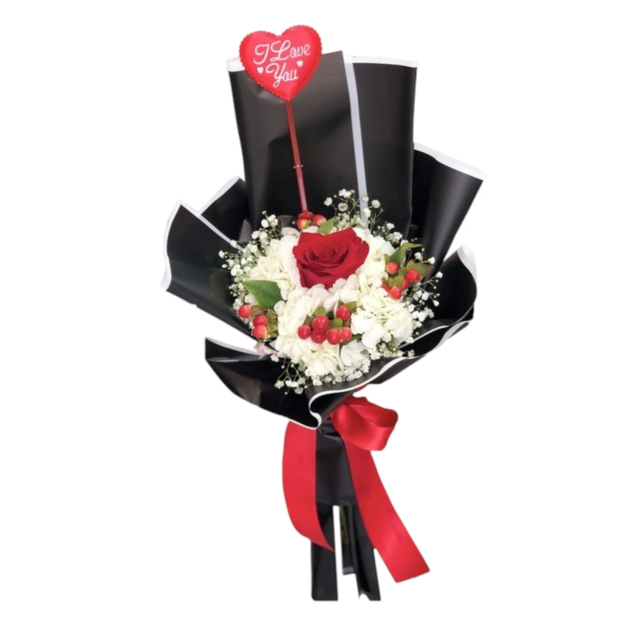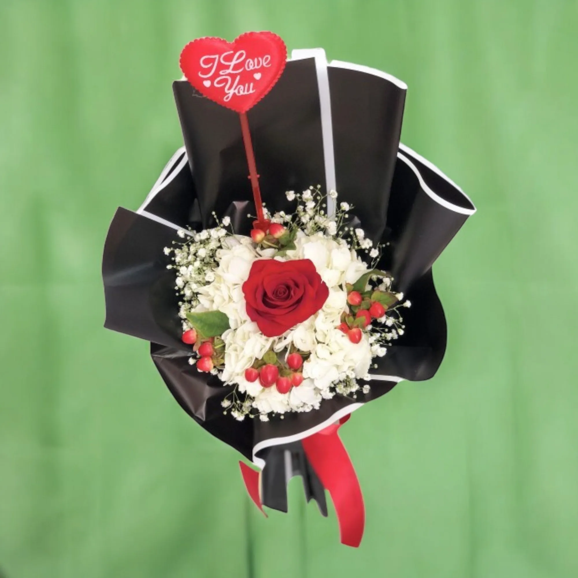 Diseño en rosa roja y hortensias surtidas, cafeto rojo, gipsophila. Papel de seda color negro y lazo rojo con Aplique en corazón (I Love you). (Envoltura sujeta a cambio según disponibilidad).