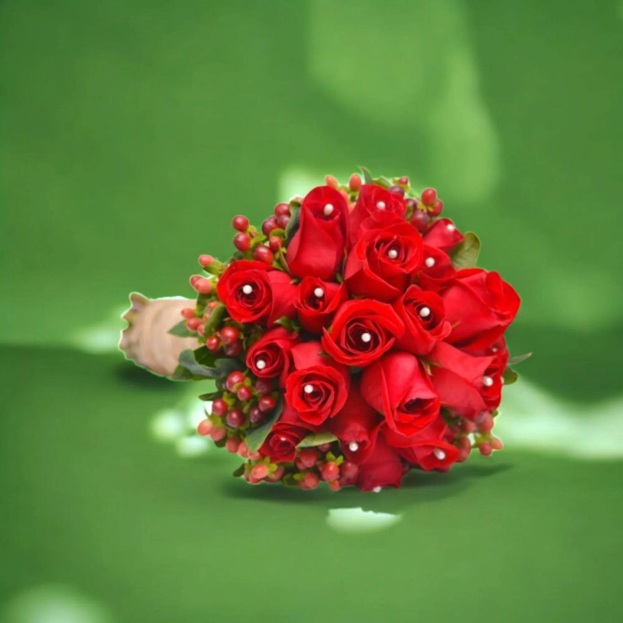 Hermoso bouquet en rosas rojas e hipérico rojo con destellos perlados.