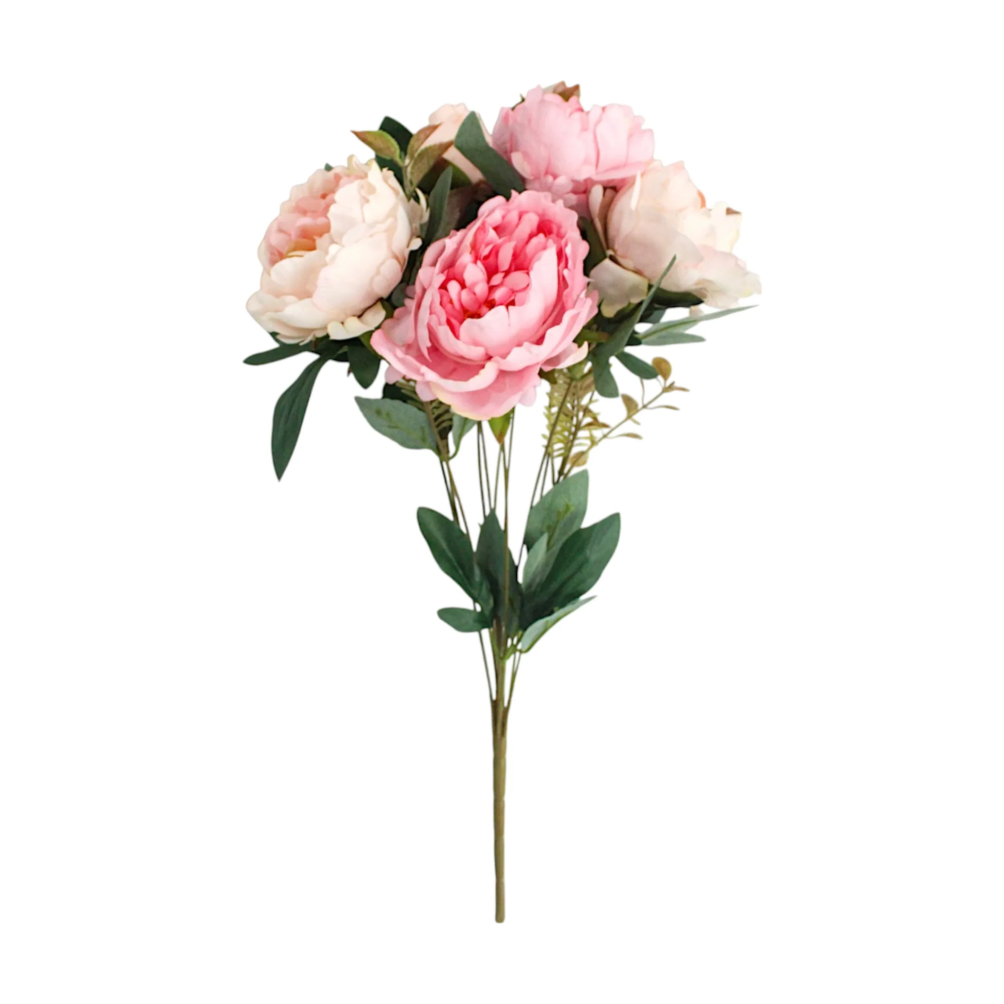 Bonche de peonías artificiales con medidas de 63 cm con pétalos de acabado realista y follaje detallado, perfectas para decoraciones y arreglos elegantes.