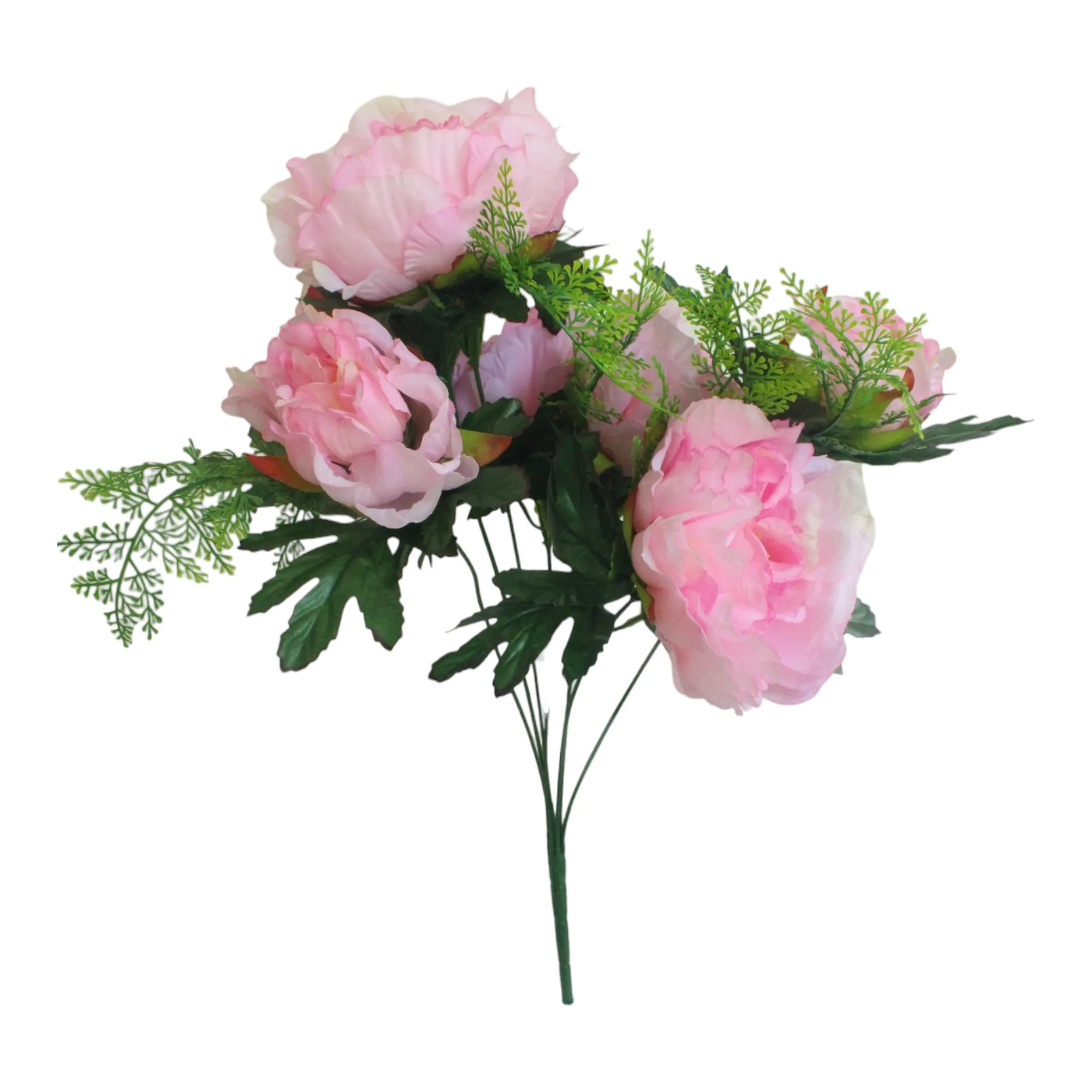 Bonche de peonías artificiales de color rosa con medidas de 50cm con pétalos de acabado realista y follaje detallado, perfectas para decoraciones y arreglos elegantes.