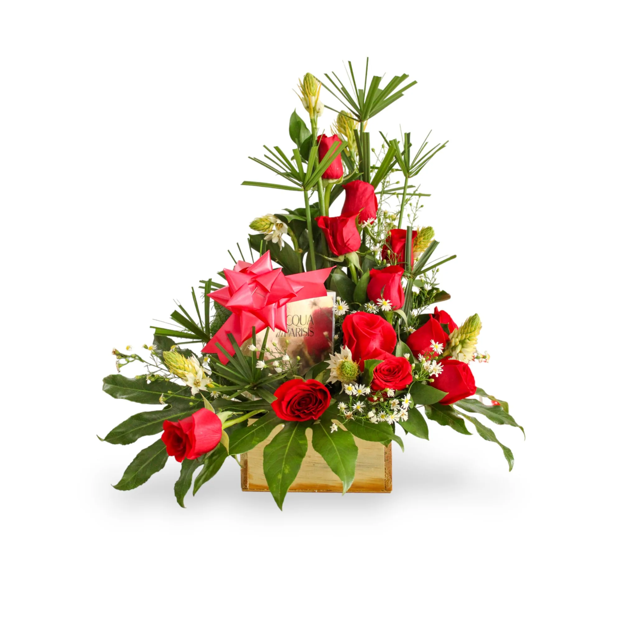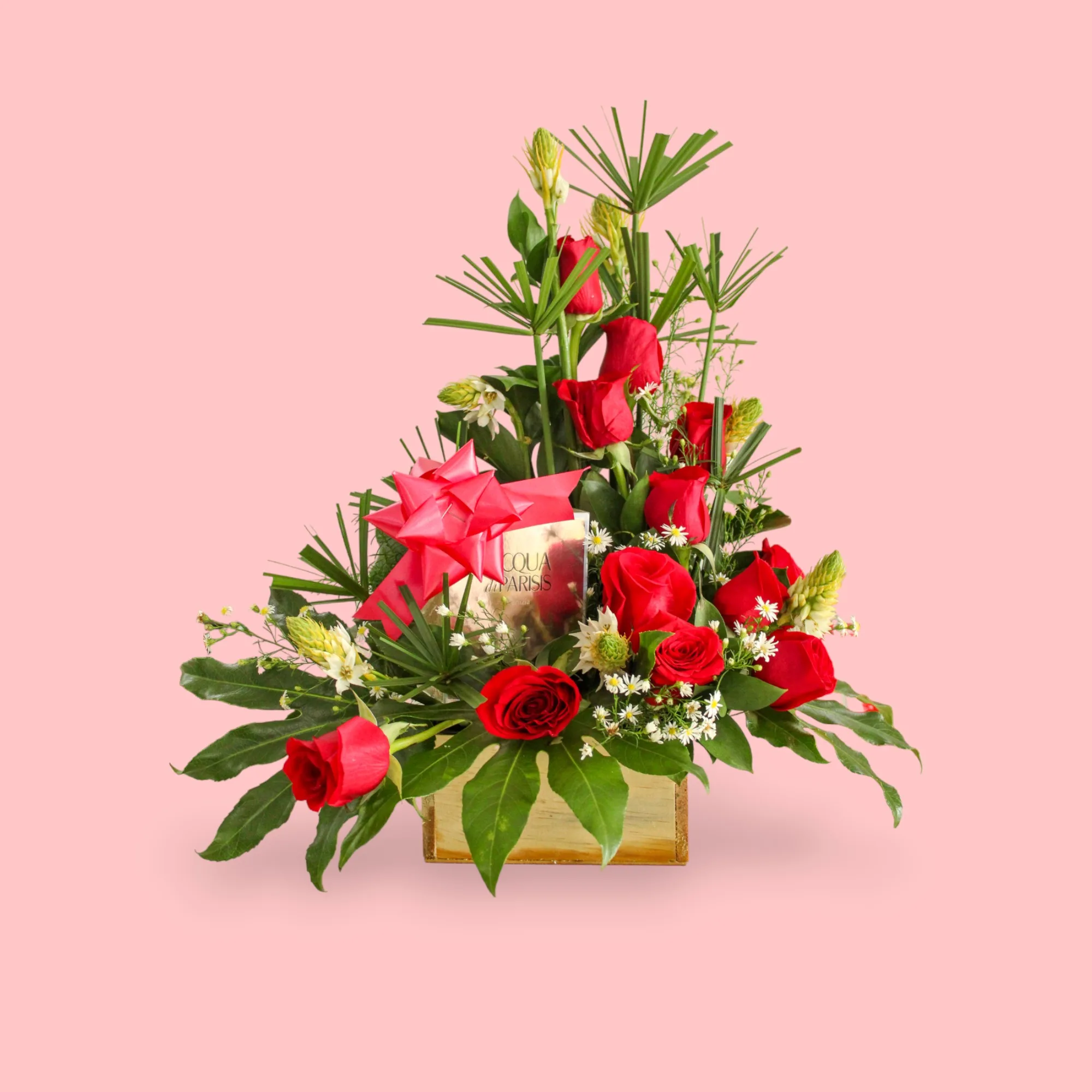 Rosas Rojas, Estrellas de Belén, Papiros, Aster y Aralias realzan tu perfume favorito en una base de madera con mucho estilo.