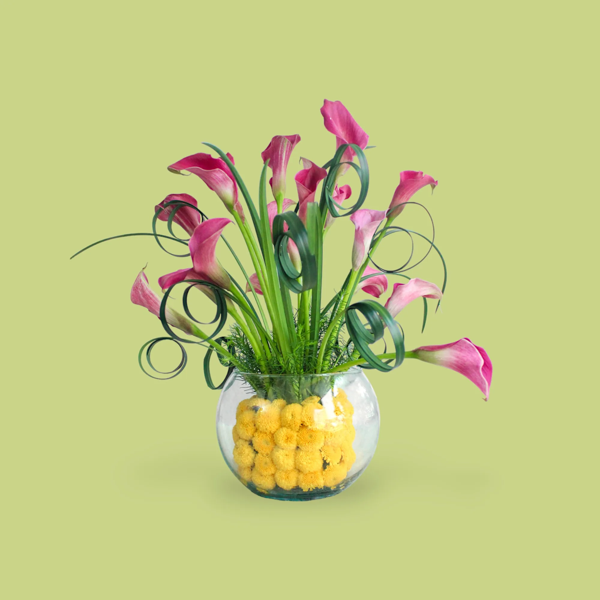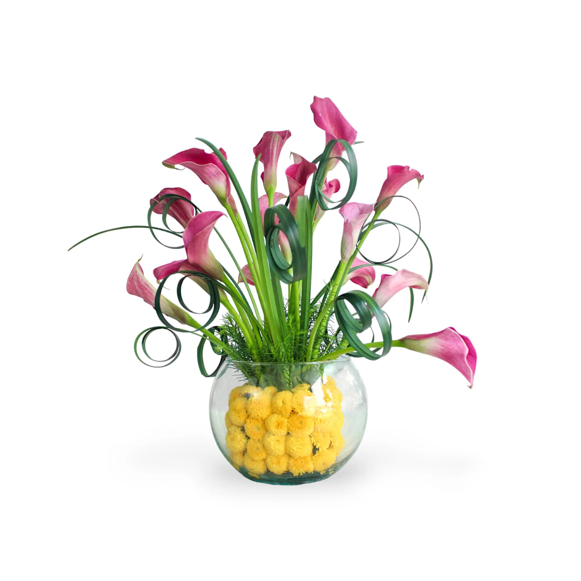 Arreglo elaborado con cala morado, pinoquio amarillo, cintilla y pino canadiense en base de vidrio.