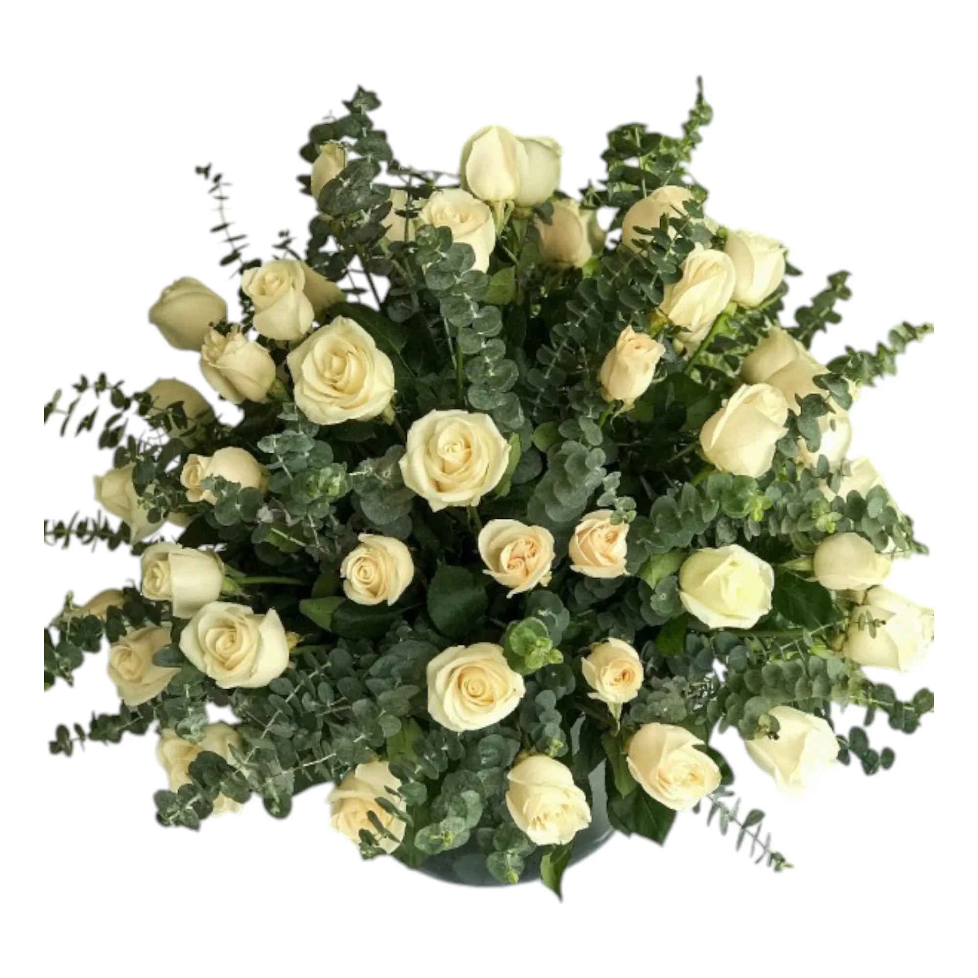 Arreglo elaborado en rosas blancas y eucalipto.