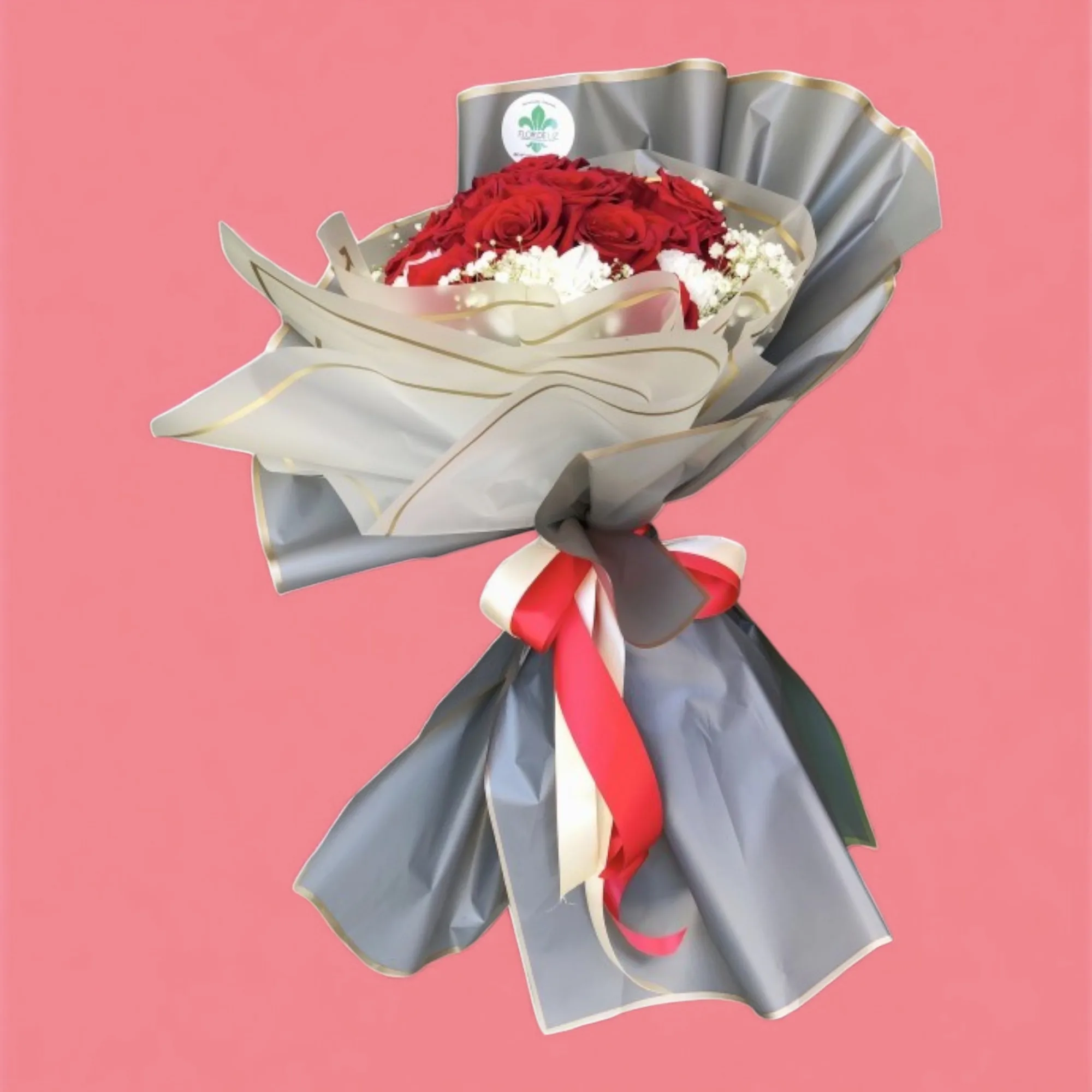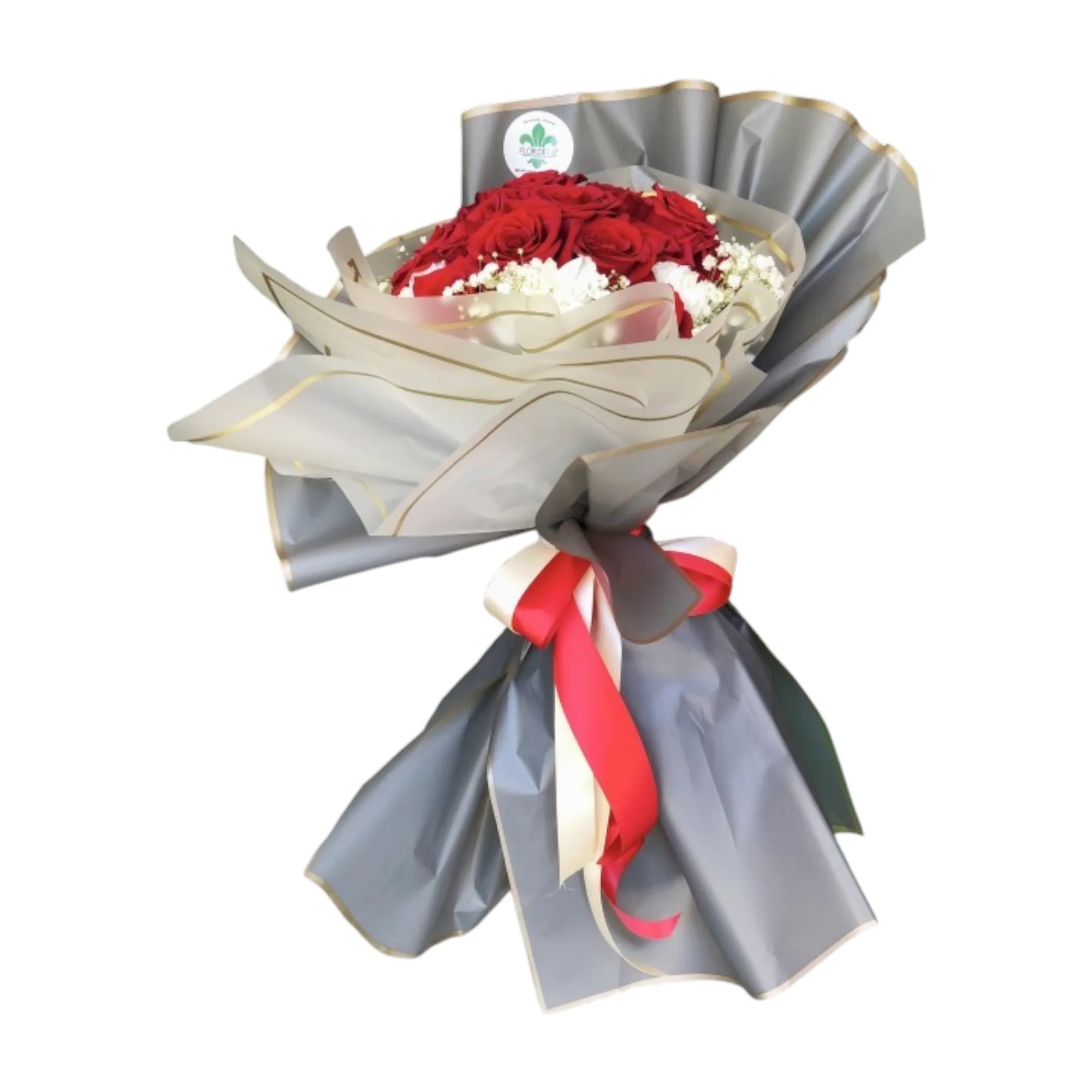Diseño elegante en rosas rojas, follaje en gypsophila y papel de seda color gris. (Envoltura sujeta a cambio según disponibilidad).