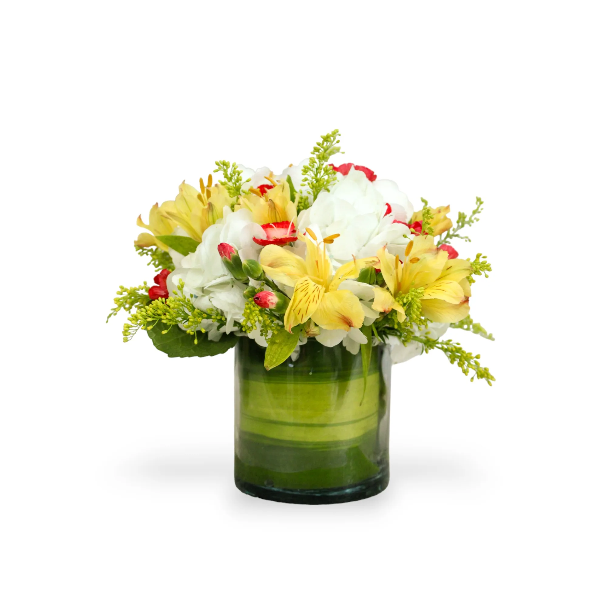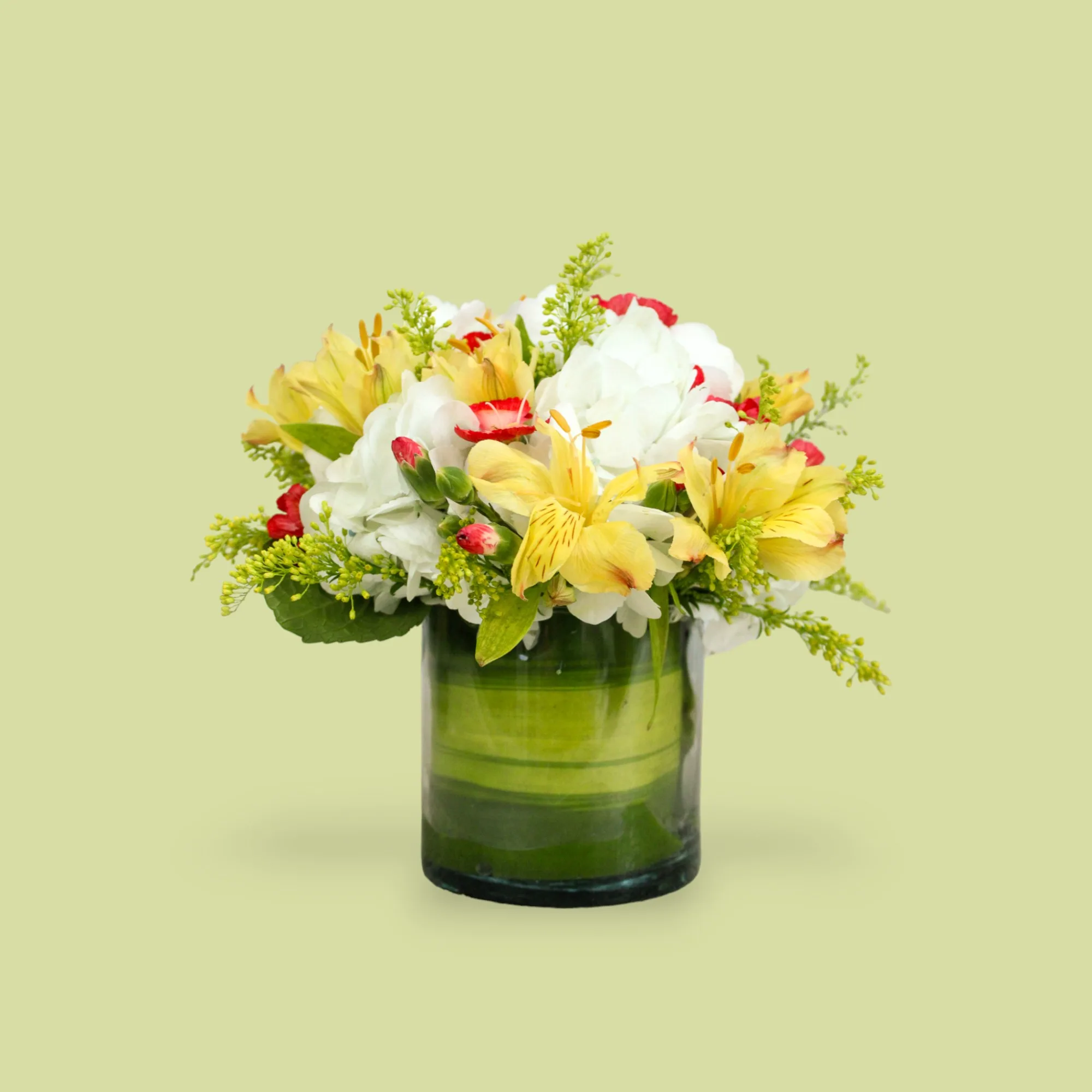 Arreglo en tonos vibrantes y delicados con hortensias, astromelias, solo mías y soliaster, en base de vidrio para aportar frescura y elegancia a cualquier ocasión.