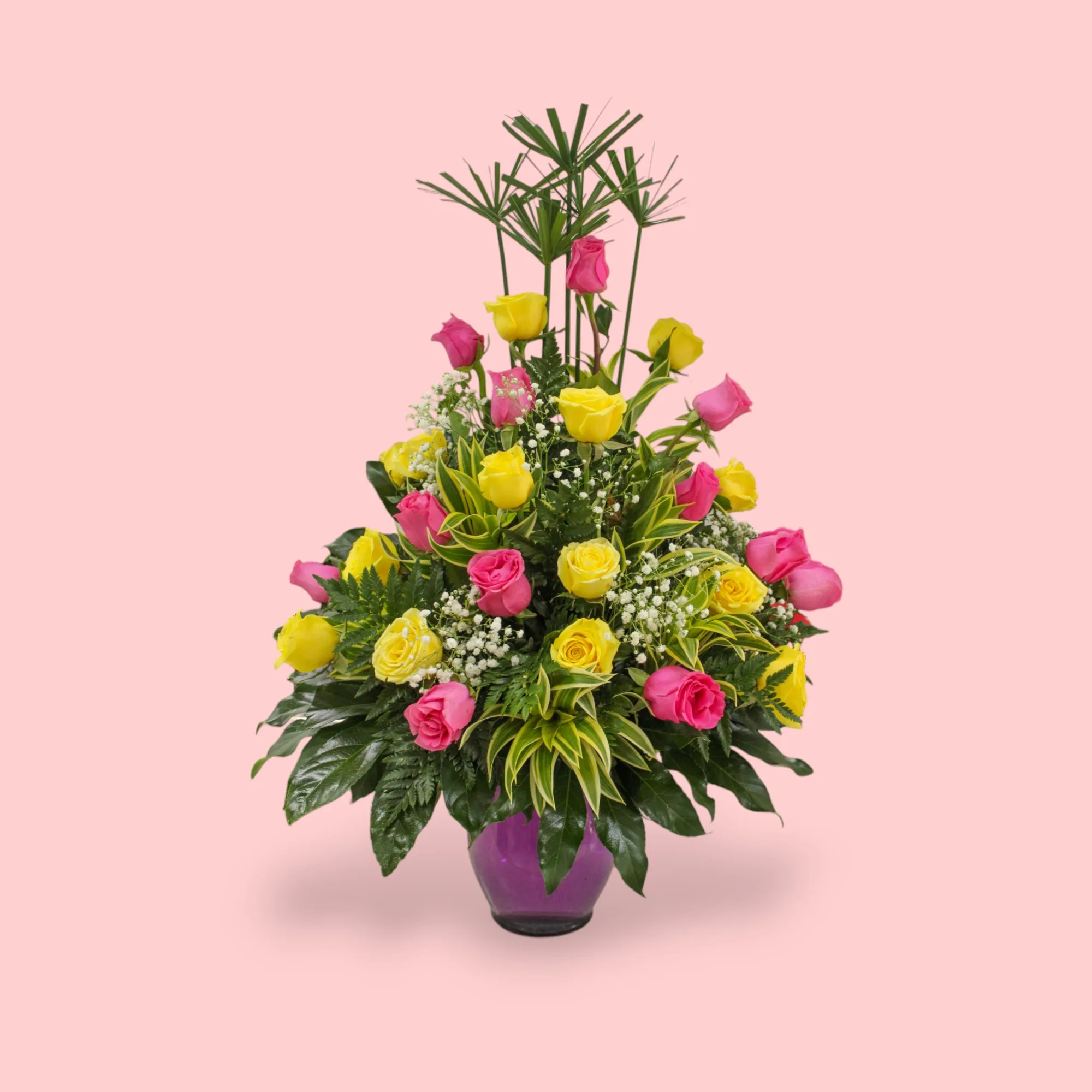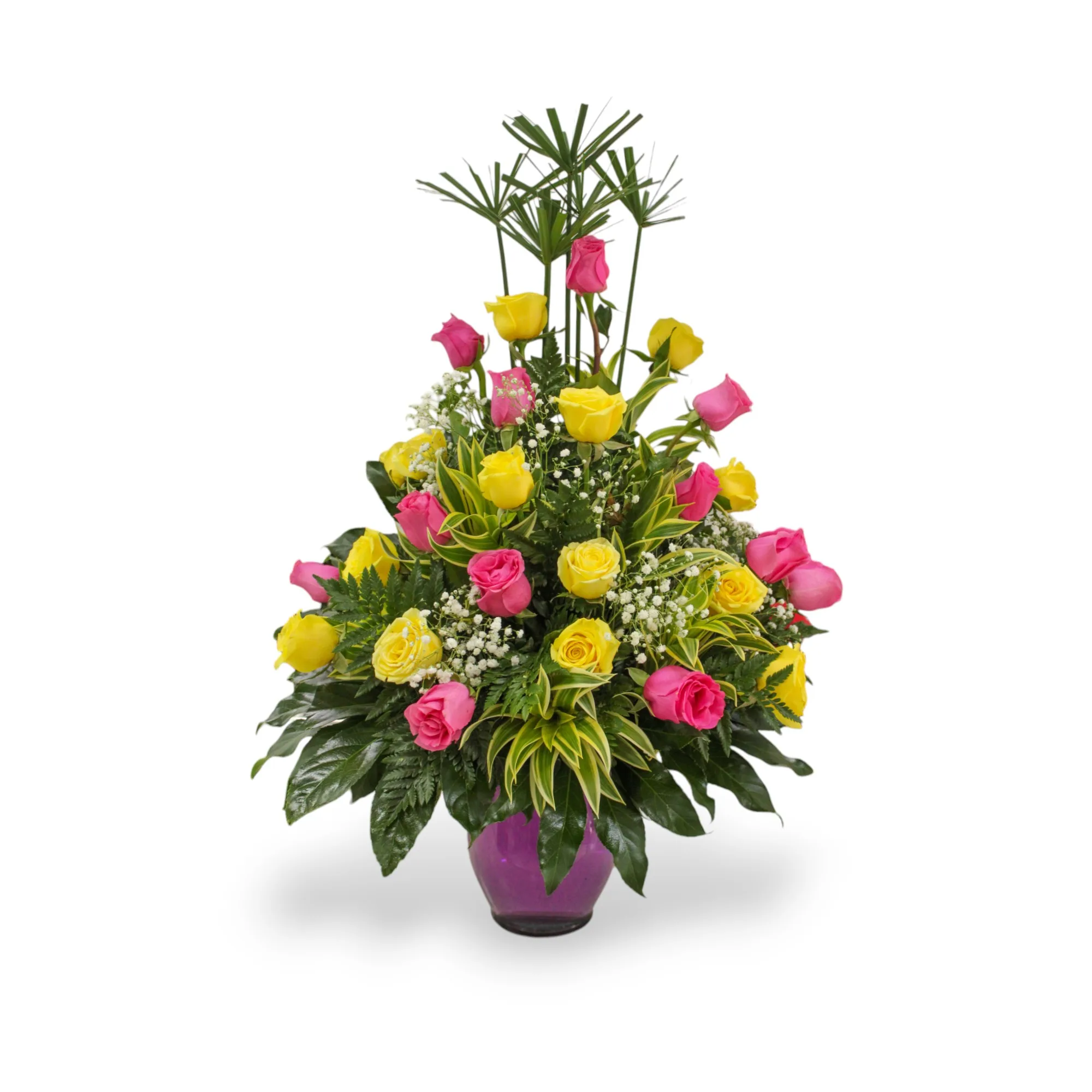 Hermoso arreglo en coloridas rosas fucsia y amarillas con follaje en manito de Dios, canción de la India, gispsofila y papiros.