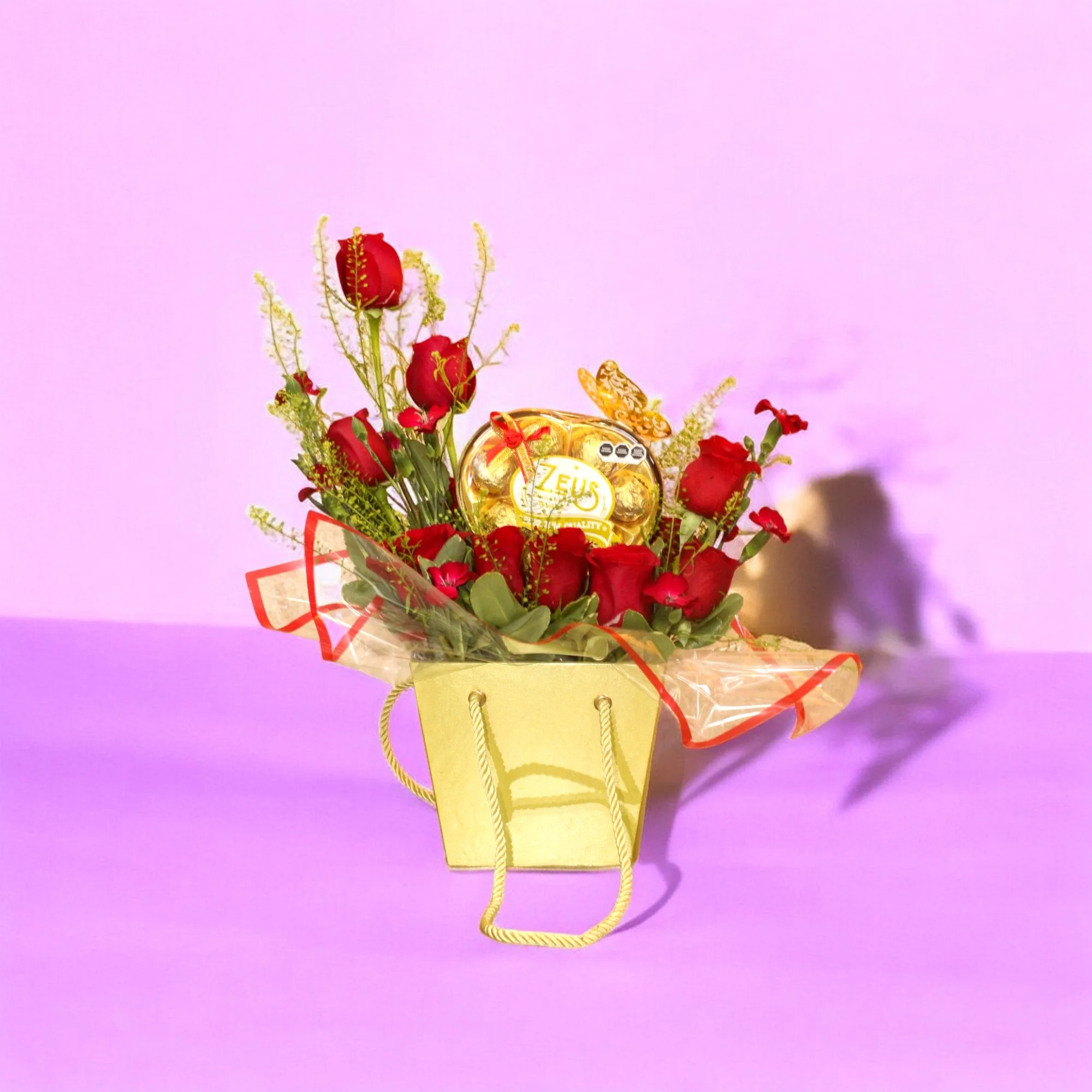 Hermosa cartera dorada elaborada en rosas rojas, soliaster, solo mias, chocolates, aplique en mariposa y papel coreano.