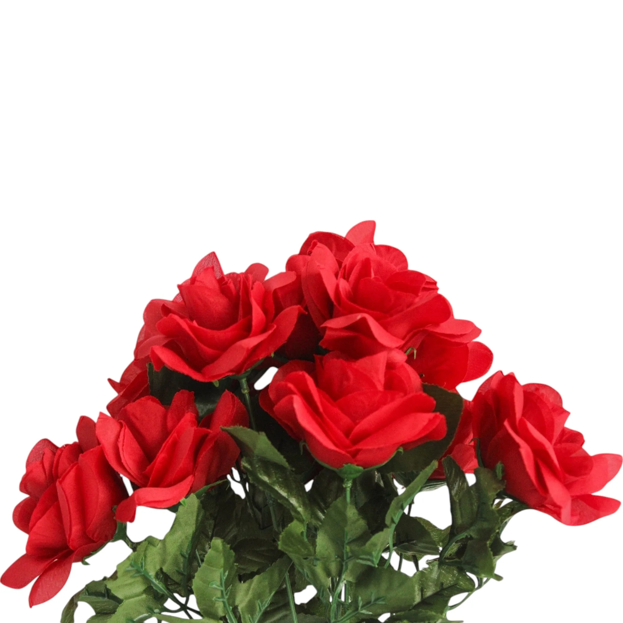 Bonche de rosas rojas artificiales con follaje, de diseño realista y pétalos detallados que reflejan elegancia y sofisticación.