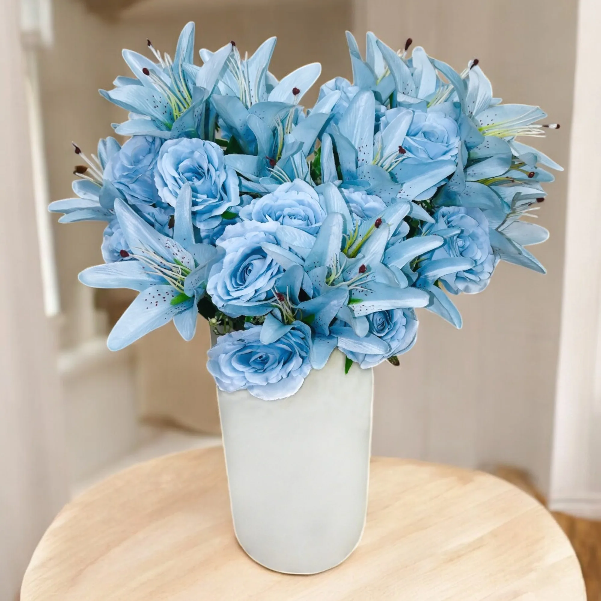 Bonche de lirios y rosas artificiales de 54.61 cm en tonos azules, con detalles realistas y una combinación armoniosa. Ideal para realzar cualquier espacio con un toque sofisticado y elegante.