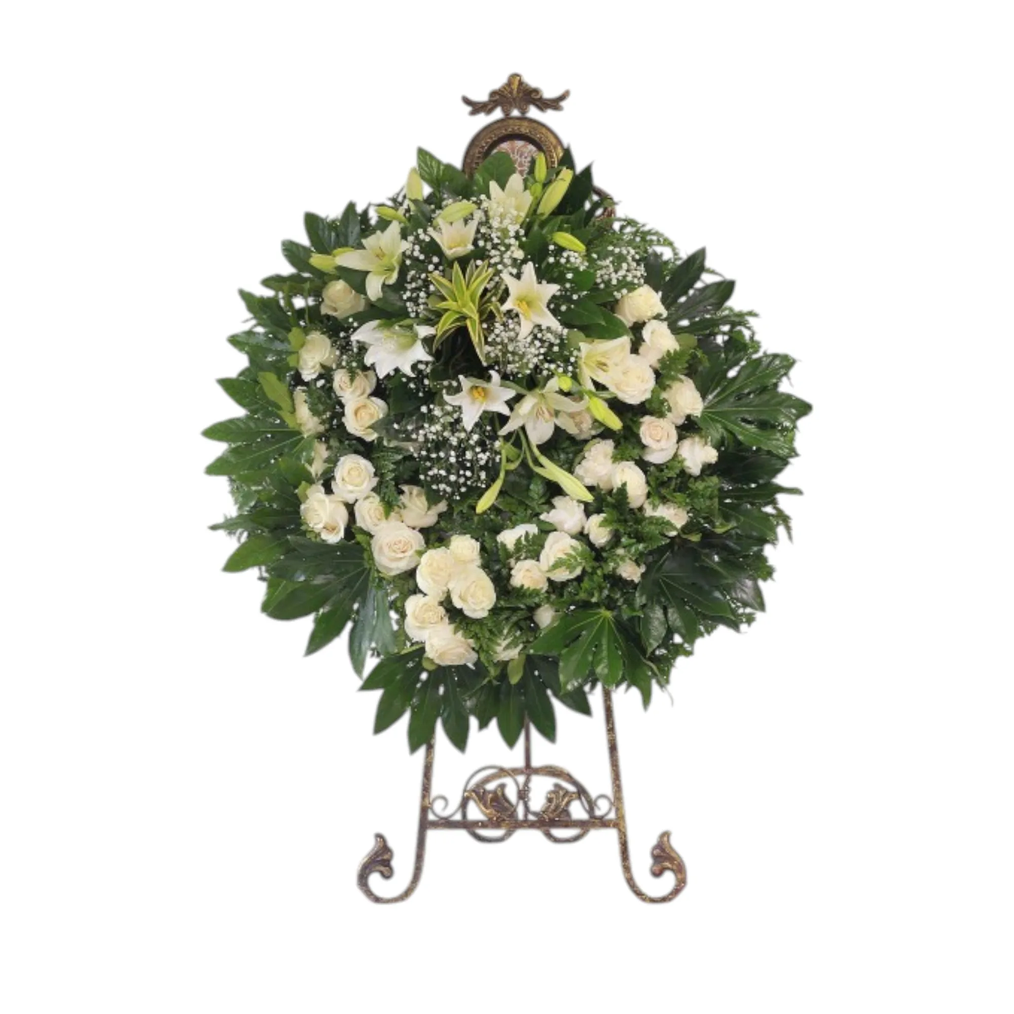 Corona en rosas blancas con apliques en lirios gipsofilias.