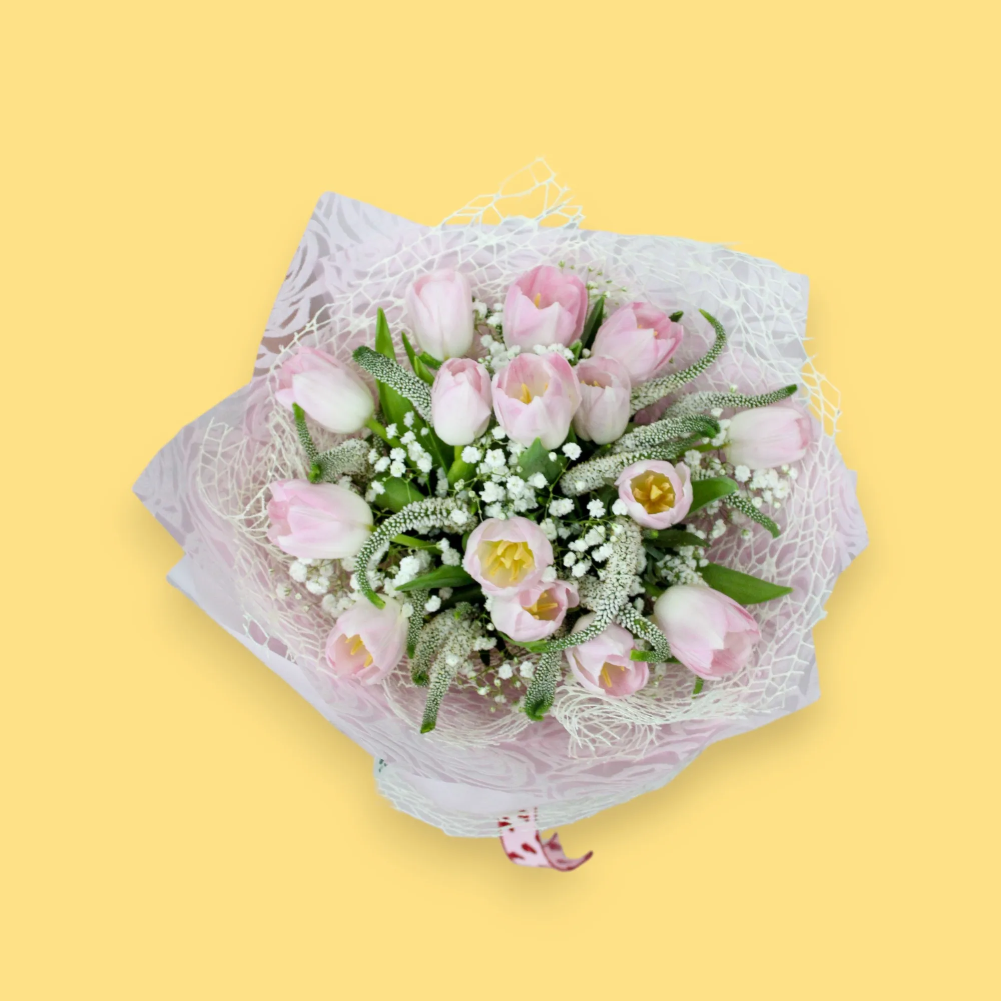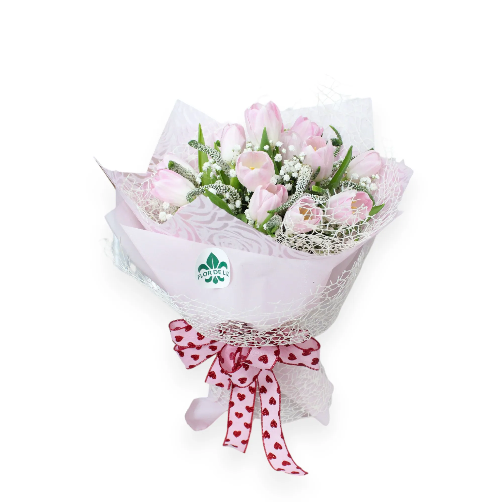 Delicado ramillete elaborado con Tulipanes rosados, Gipsofilia y follajes, envuelto en papel coreano, malla y adornado con un lazo en cinta estampada.