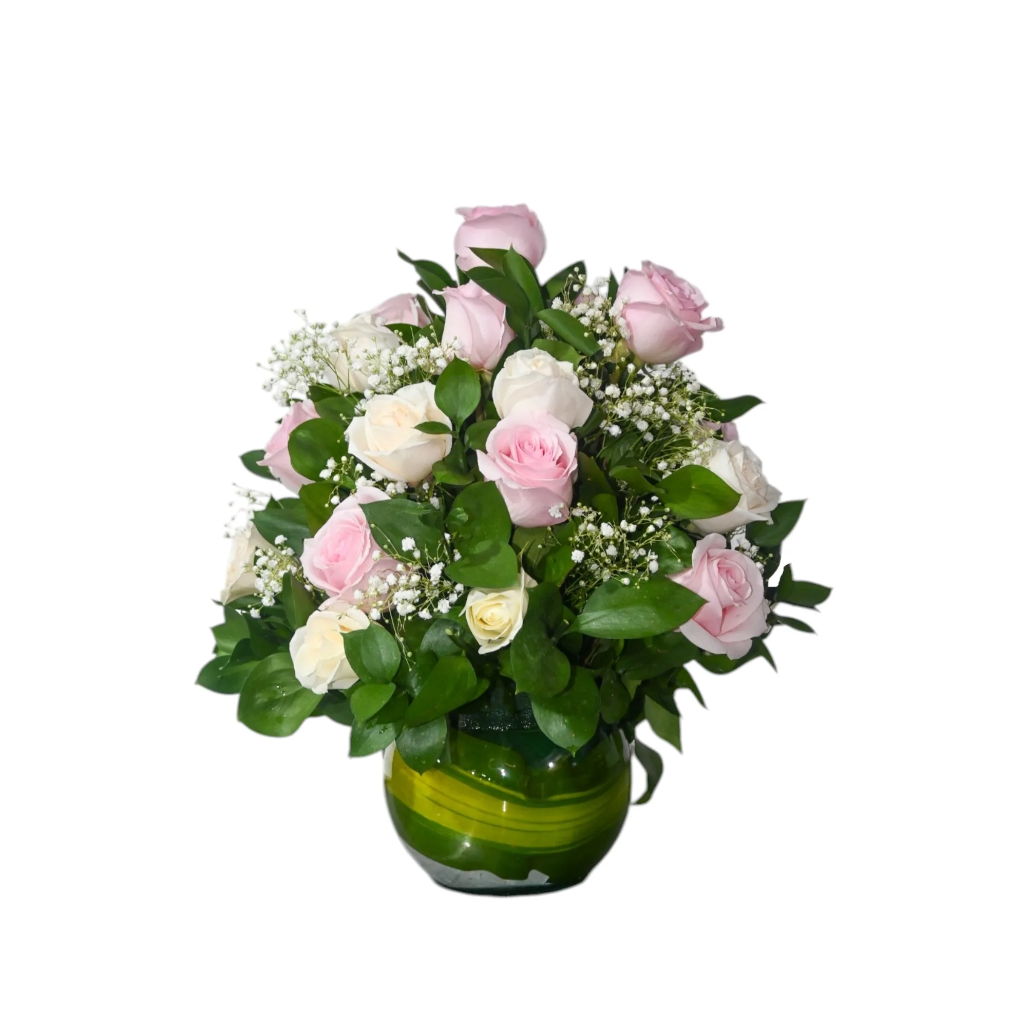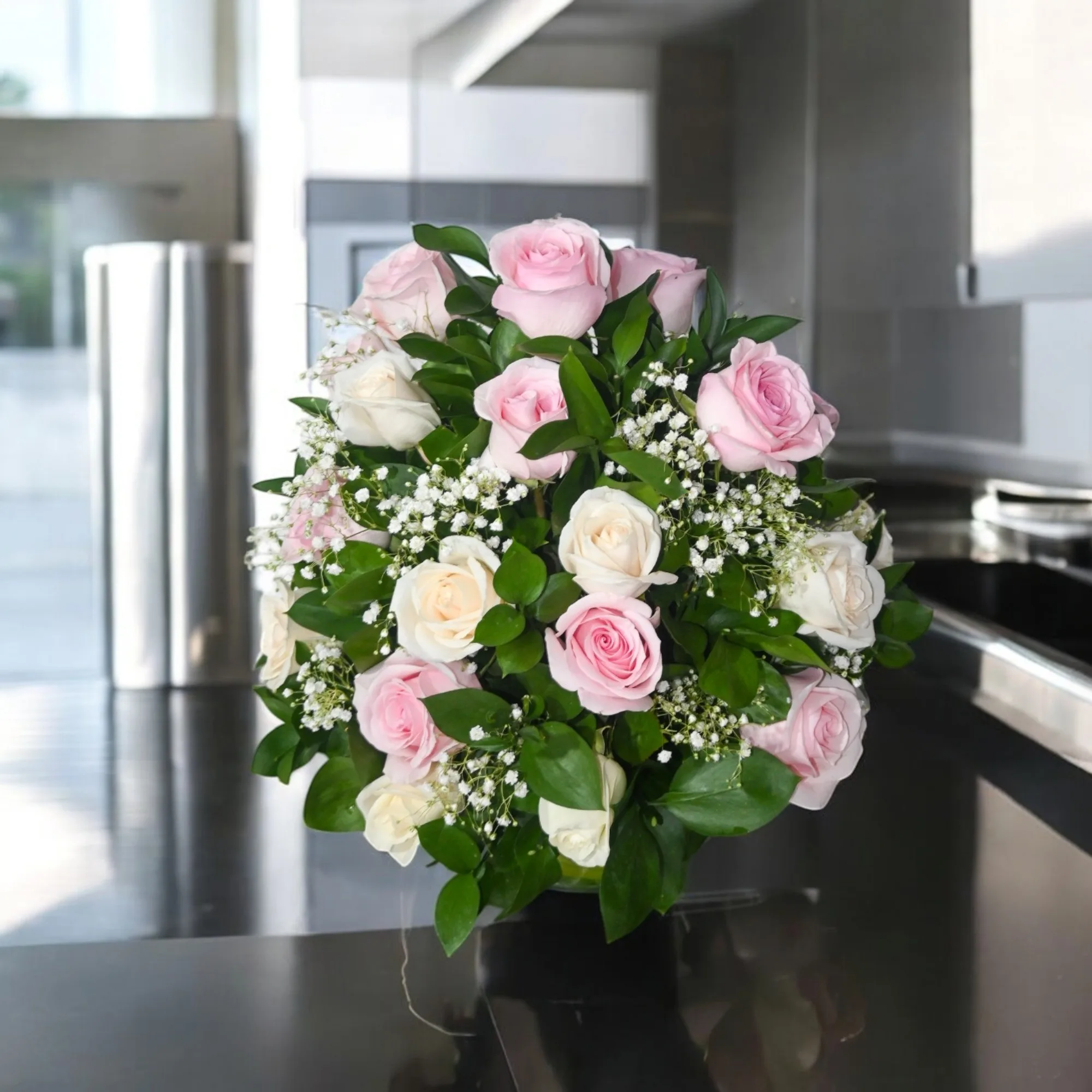 Un toque de suavidad y armonía, con el contraste de rosas blancas y rosadas, acompañadas de la sutileza del rusgo y la ligereza de la gipsofila.