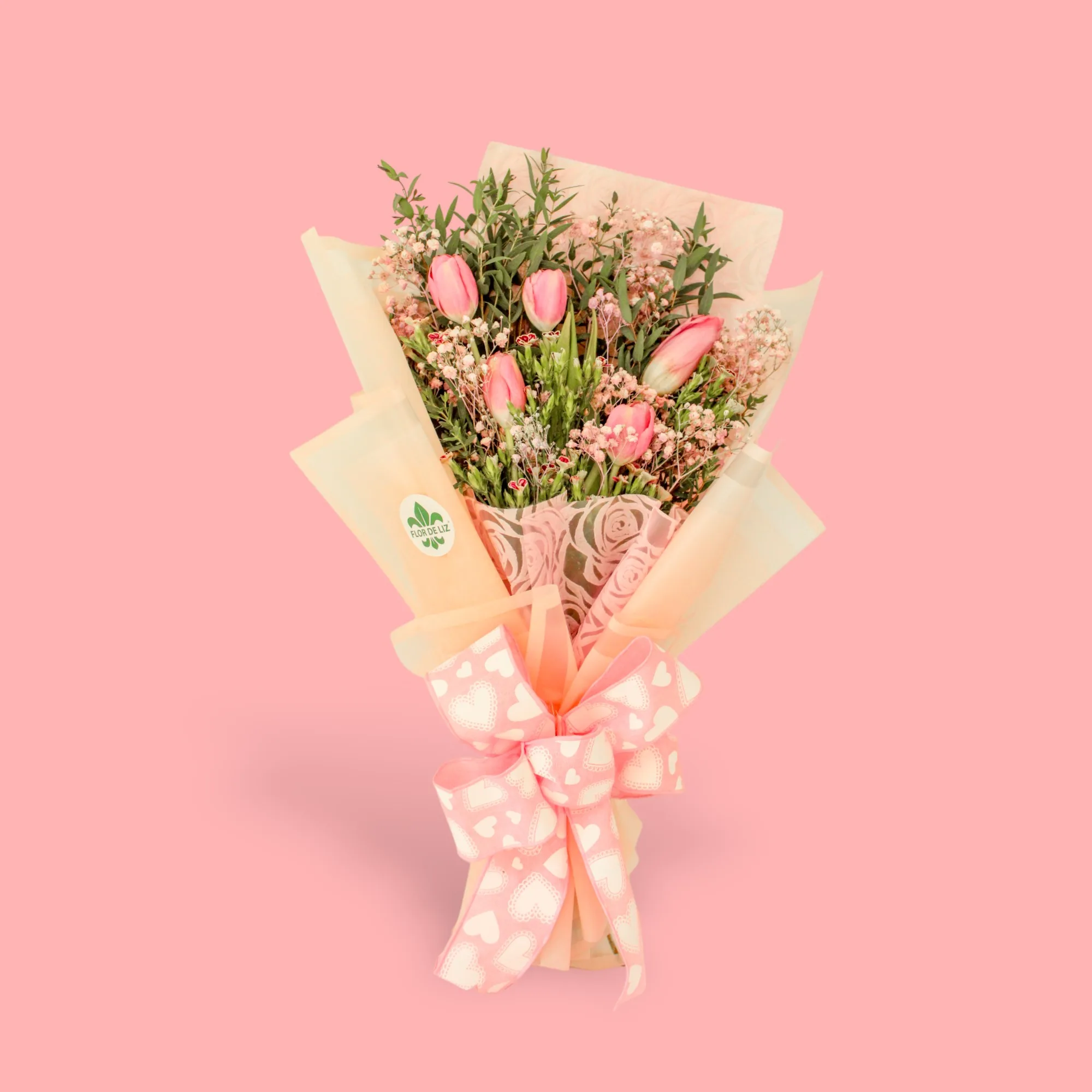 Hermoso ramillete elaborado con Tulipanes rosados, Gipsofilias, Eucaliptos y Rafines, envuelto en papeles de seda y adornado con cinta estampada.