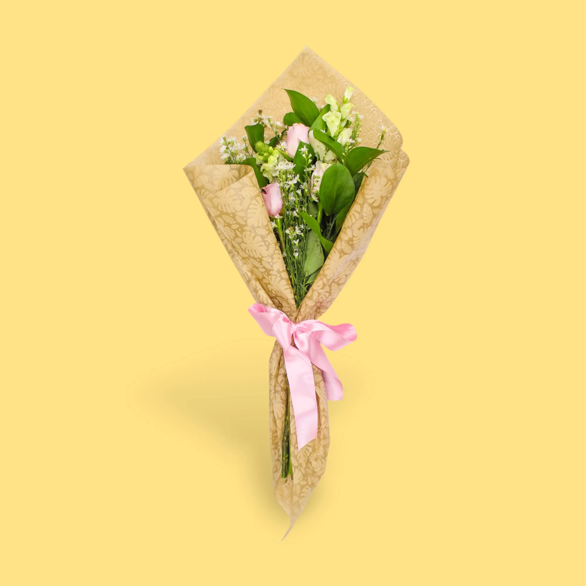 Hermoso ramillete elaborado con rosas en combinación con boca de dragón, rusgo y asther, que aportan textura y movimiento.