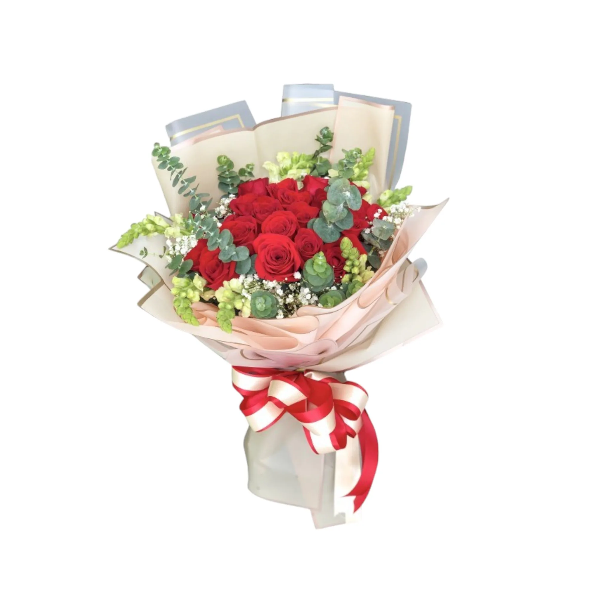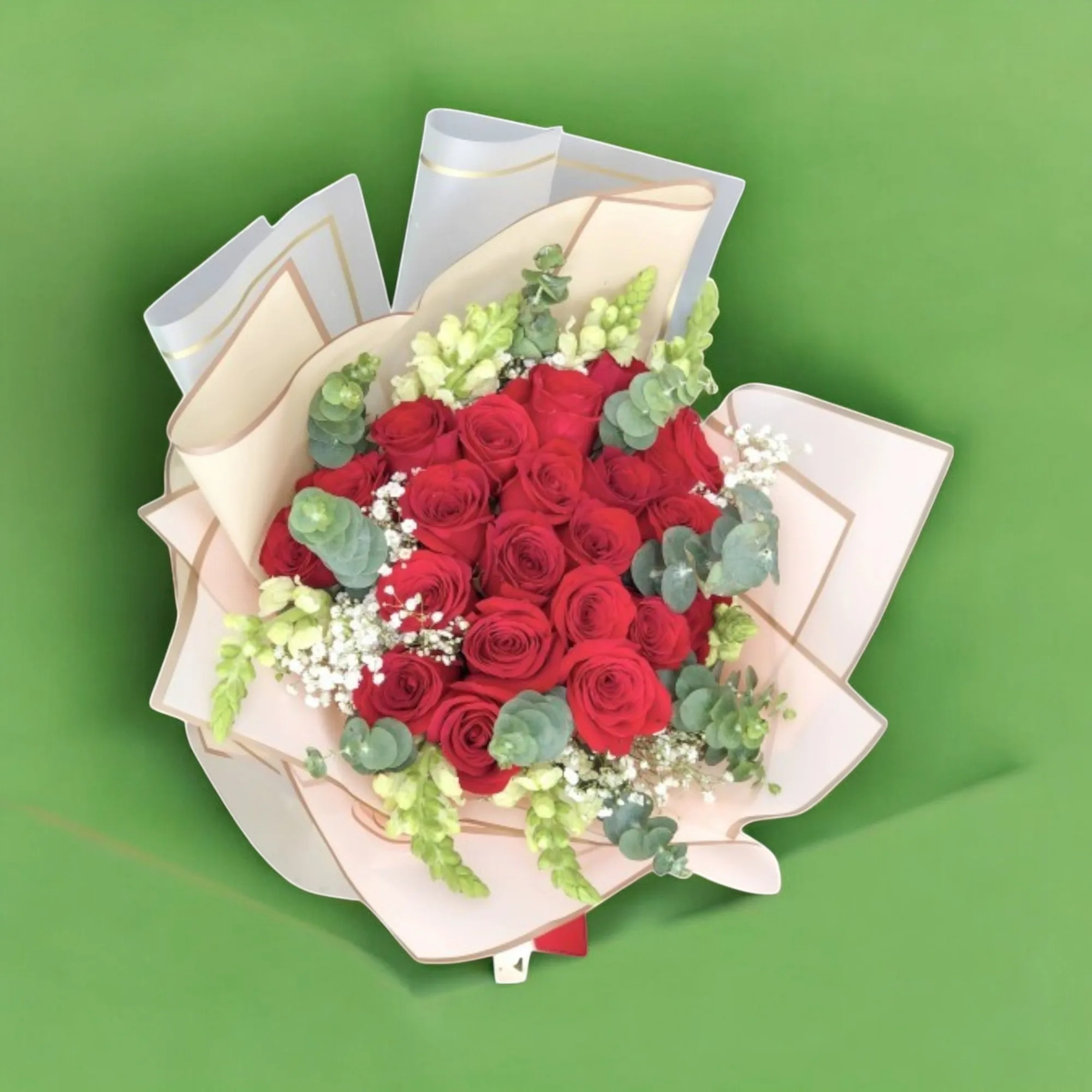 Diseño en rosas rojas, eucalipto, boca de dragón, follaje en gipsophila. Papel en seda color blanco, beige y lazo rojo.