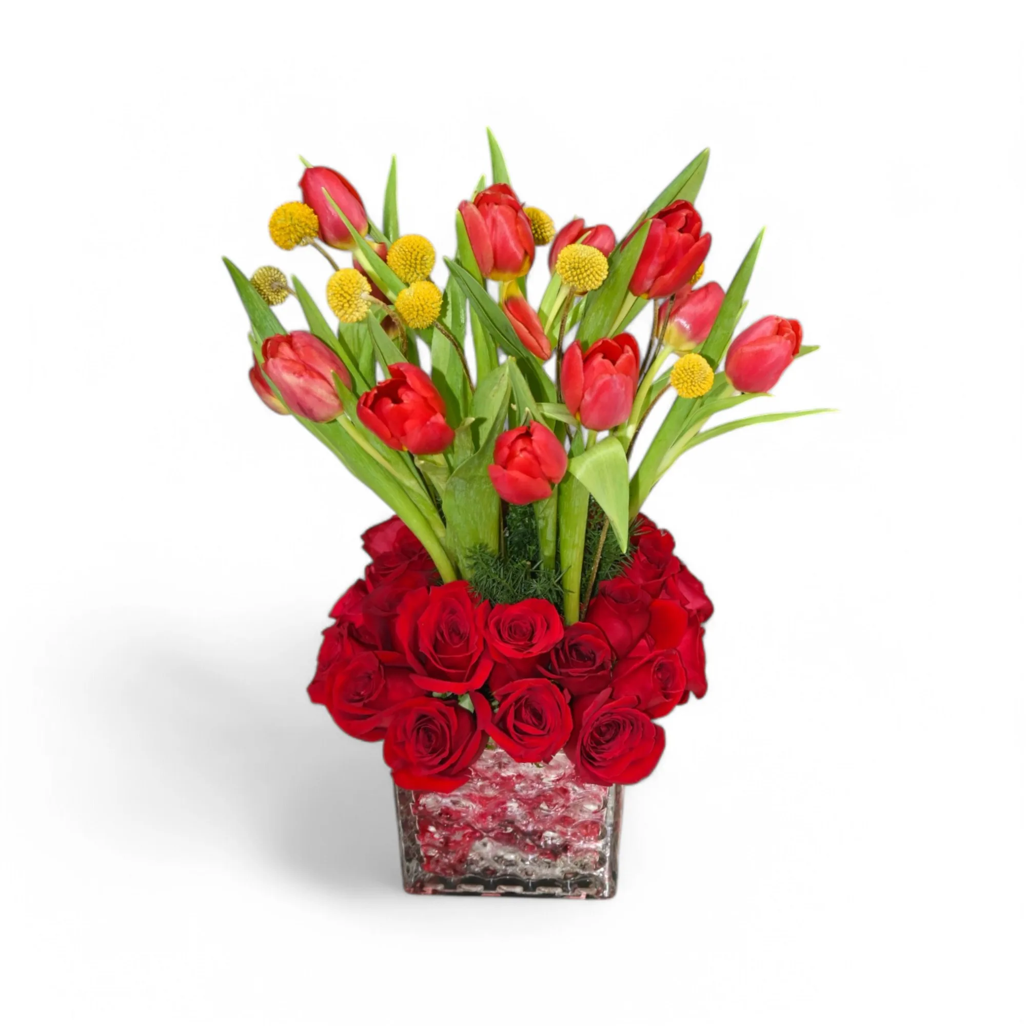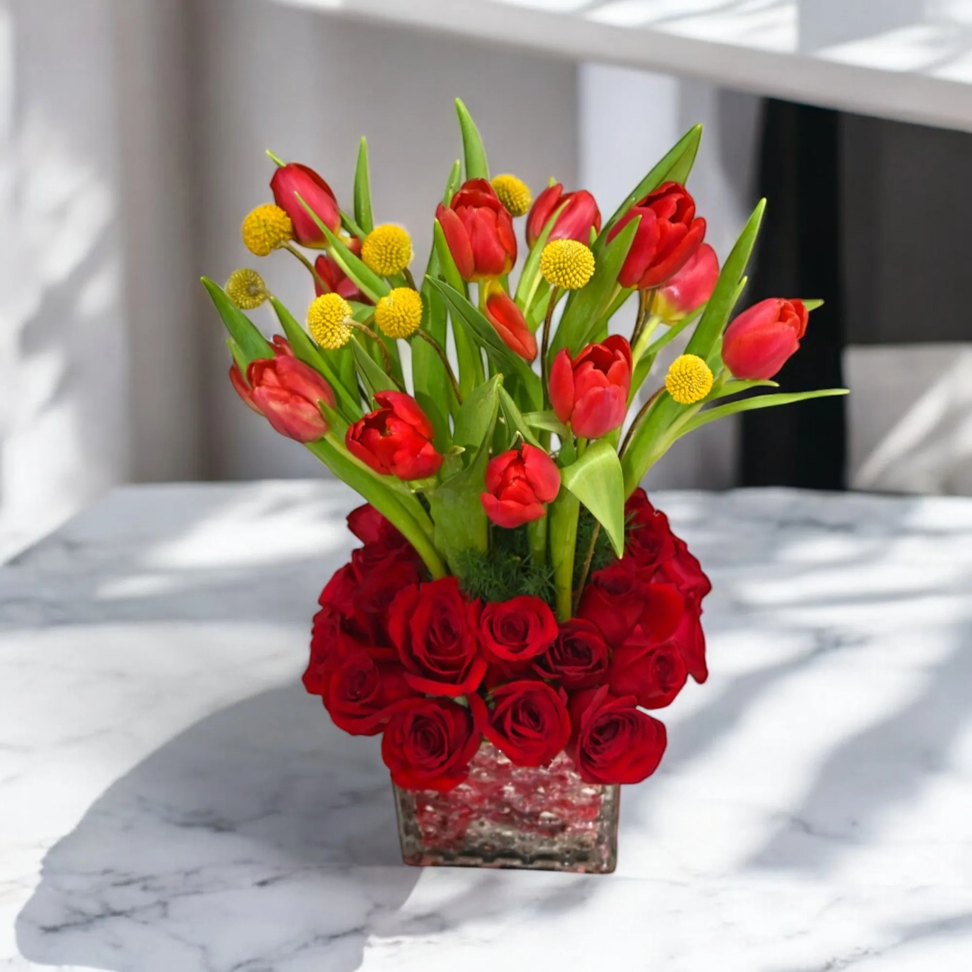 Tulipanes, Rosas y Craspedias se elevan con gracia en una base transparente que realza su fuerza y color.