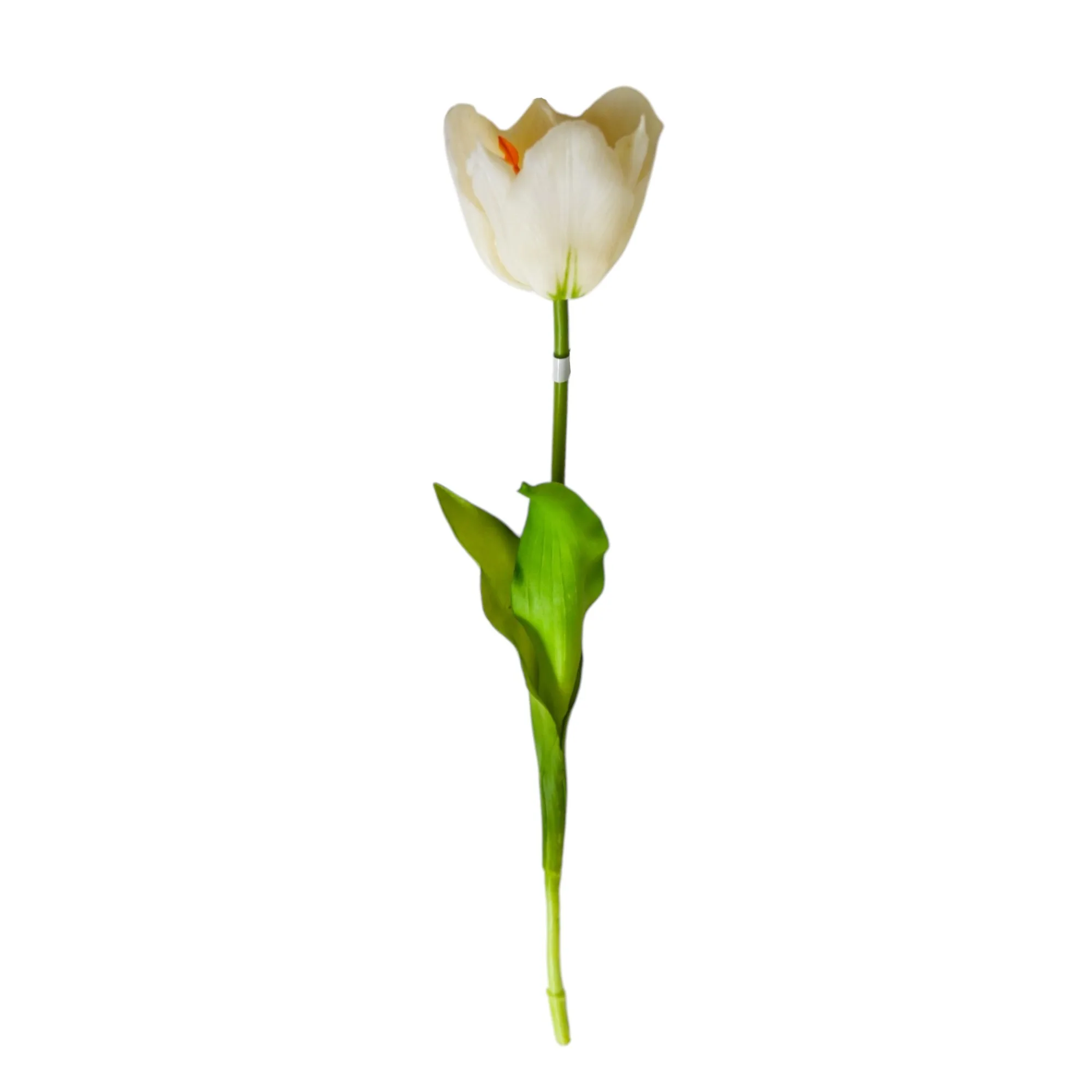 Tulipán blanco artificial, bañado en silicona para un acabado natural, con medidas de 48 cm de alto.