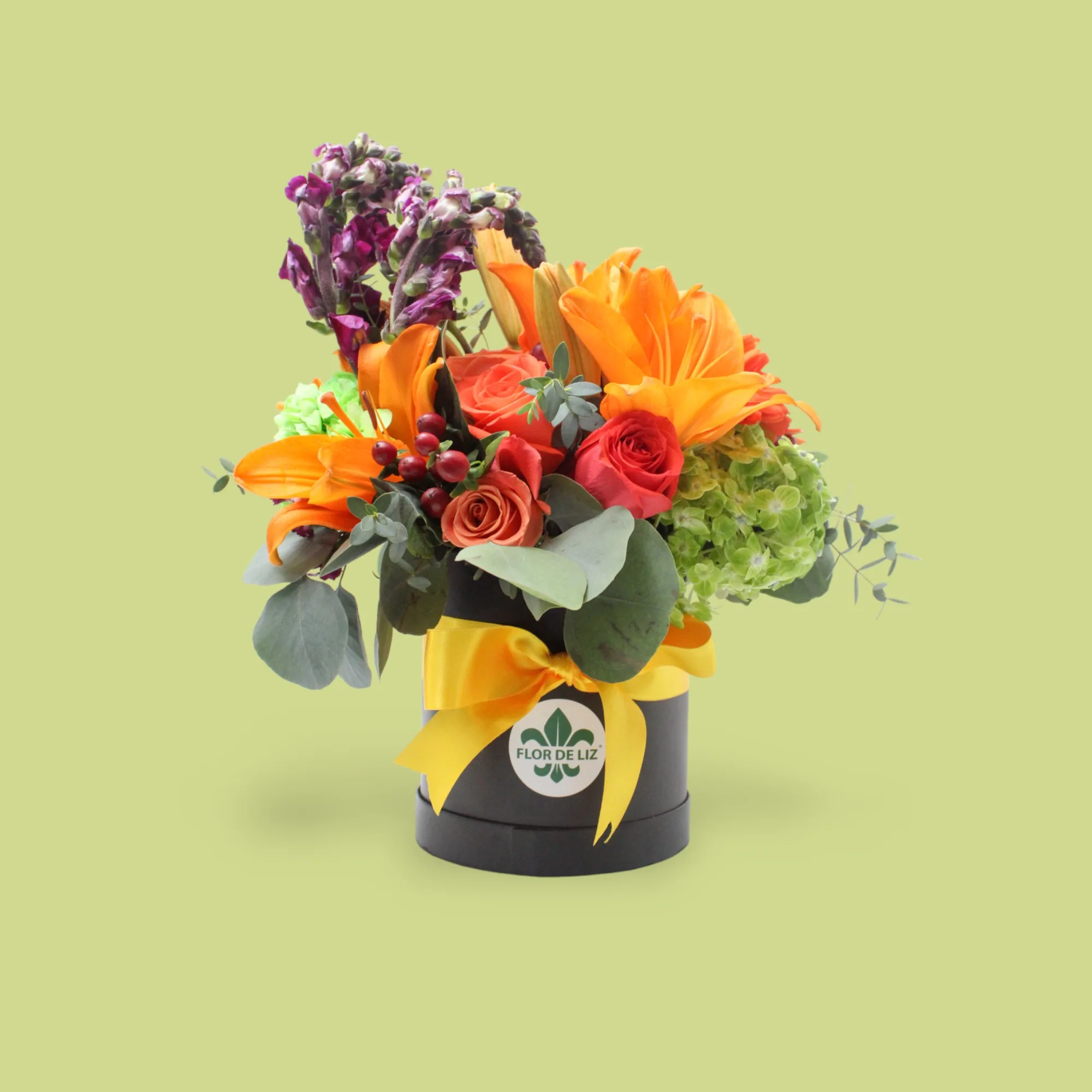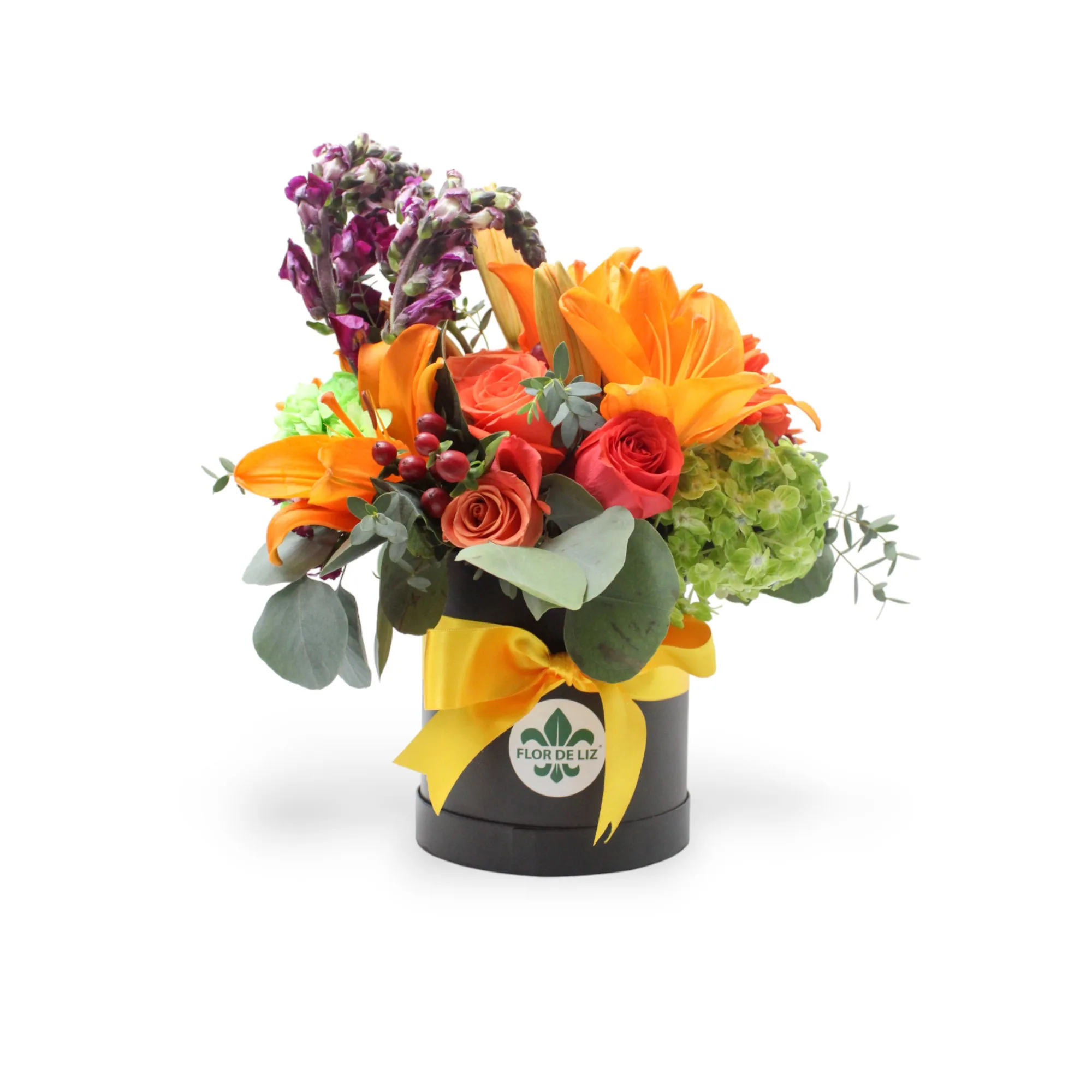 Hermosa caja elaborada con hortensias, rosas en tonos naranjas, lirios naranjas, boca de dragón morado, cafeto rojo, eucalipto y lazo en cinta de tela.