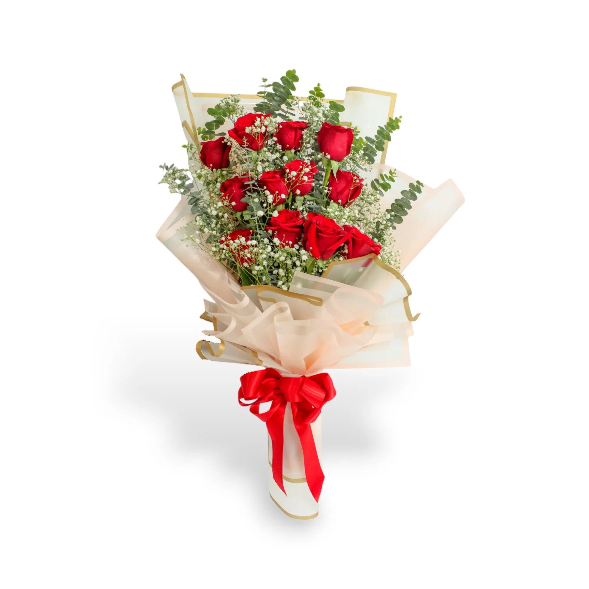Hermoso ramillete elaborado con Rosas rojas, Gipsofilia, Eucalipto, envuelto en papel coreano y adornado con un lazo en cinta de tela.