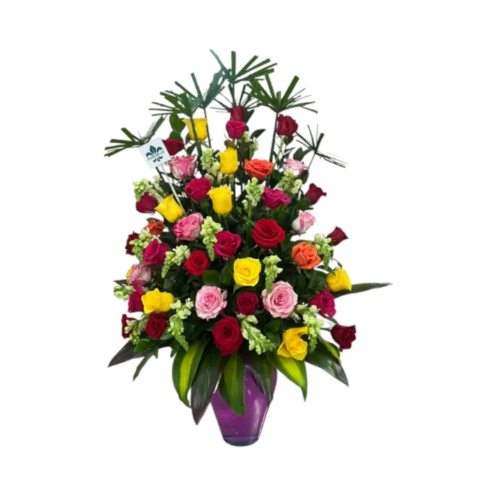 $380,000Hermoso arreglo elaborado en rosas surtidas, papiro, boca de dragón y follaje en base de vidrio. *Base sujeta a cambios según disponibilidad. - (0 review)