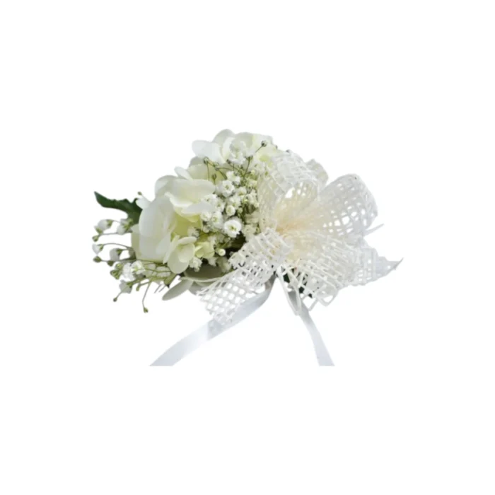 $25,000Brazalete en hortensias, gipsófilas, helecho cuero y lazo en malla.
