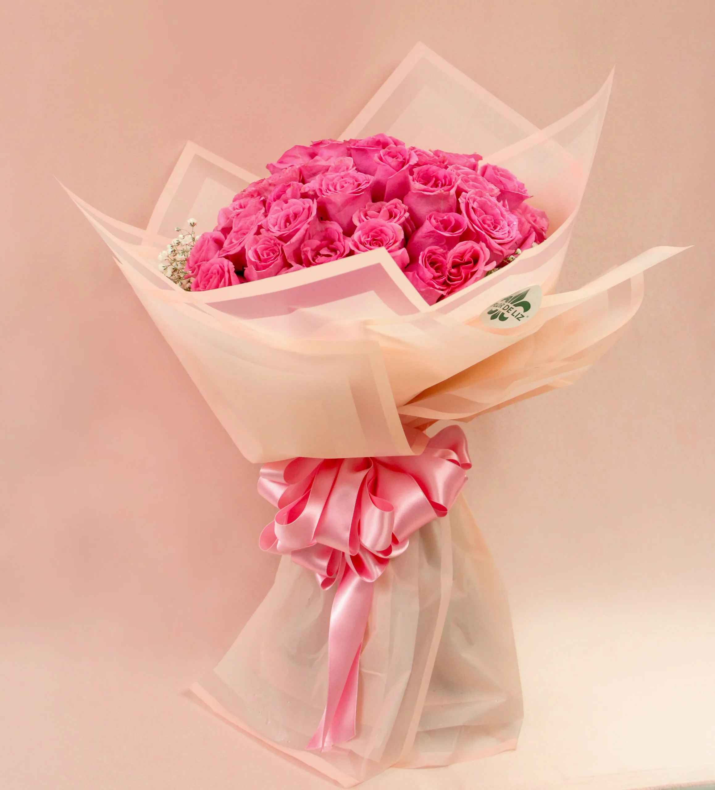 Delicado ramillete elaborado con en rosas, gipsófila, envuelto en elegante papel coreano y adornado con un lazo en cinta de seda.