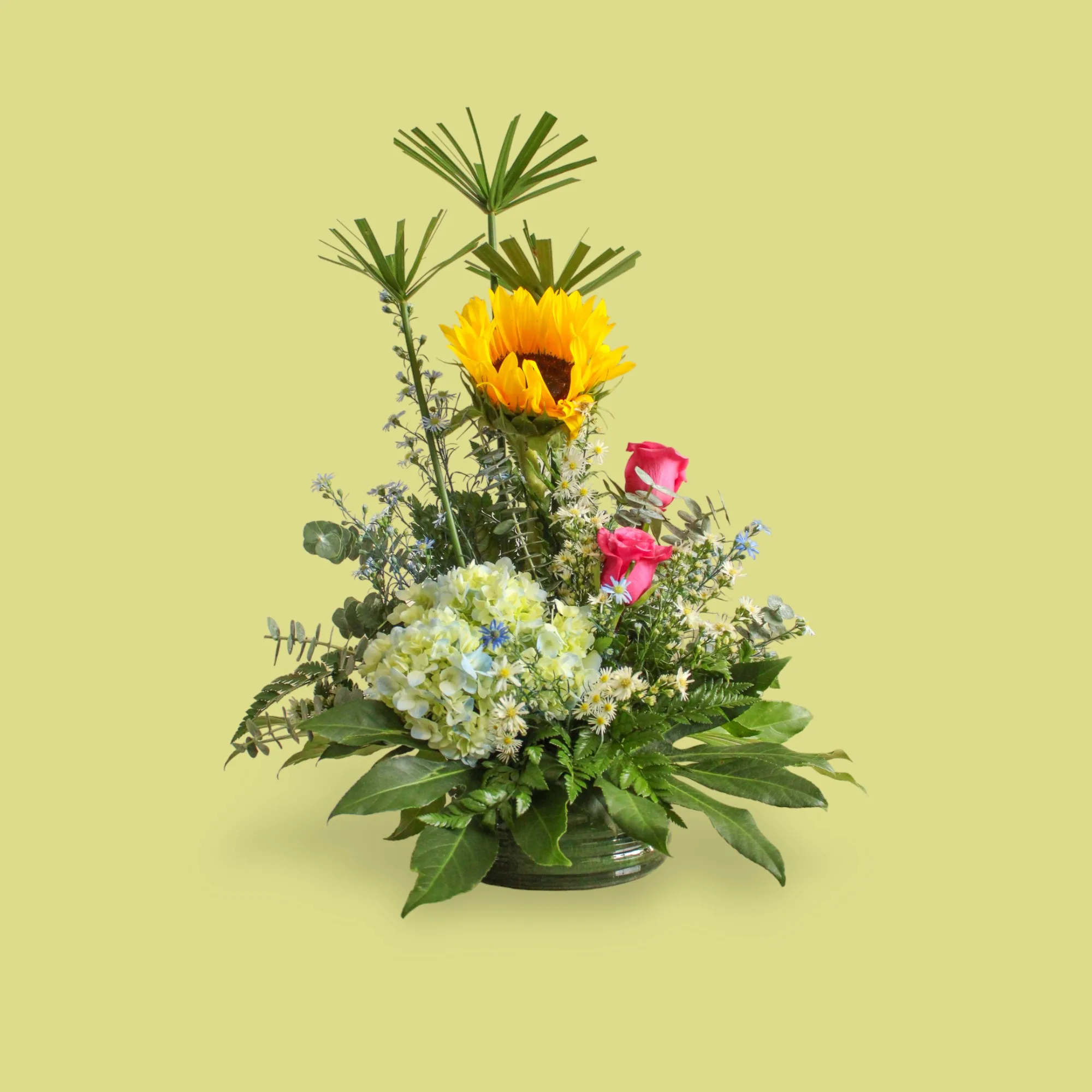 Este arreglo único, con hortensias, girasol, aster y más, encierra la esencia de la belleza más pura. Ideal para regalar o para adornar ese espacio especial.