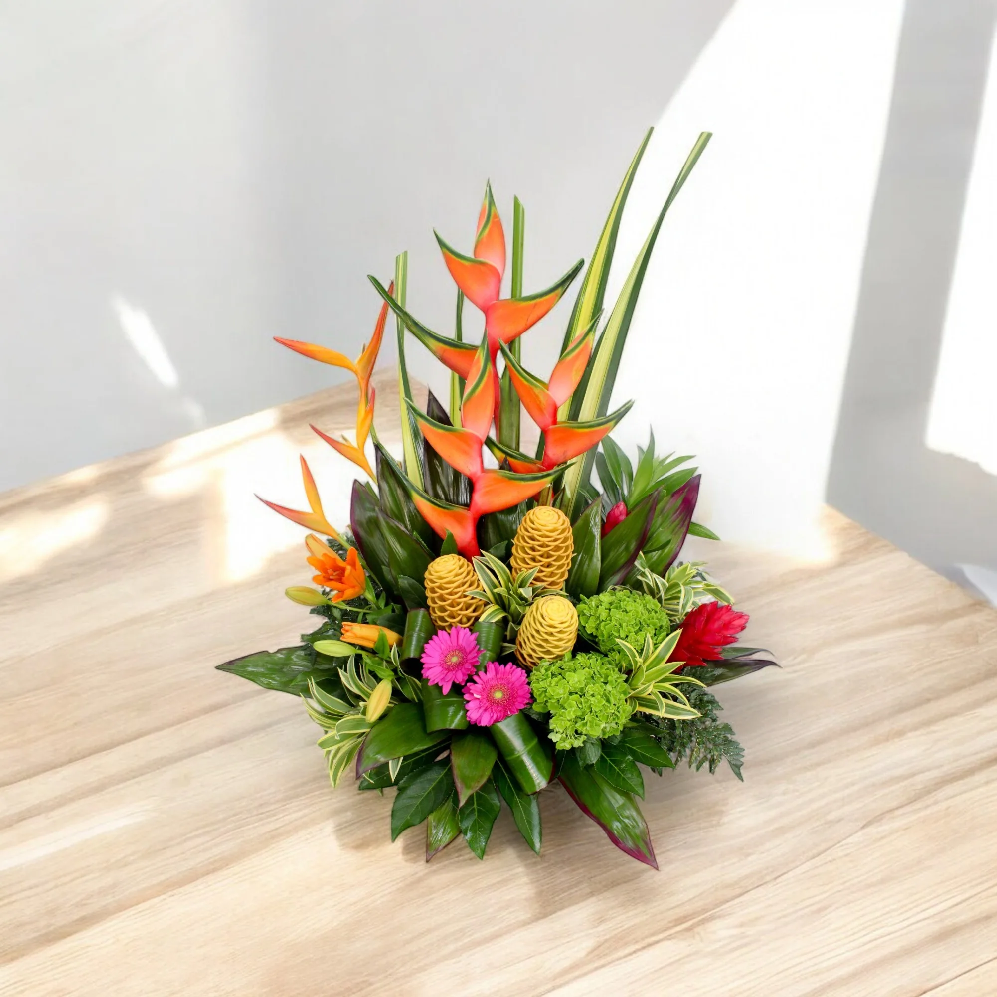 Hermoso arreglo elaborado con heliconias, gerberas, anturio, hortensias, canción de la India, maracas, ginger, helecho cuero, manito de Dios y hoja de carey, todo dispuesto en una base de canasta elegante.