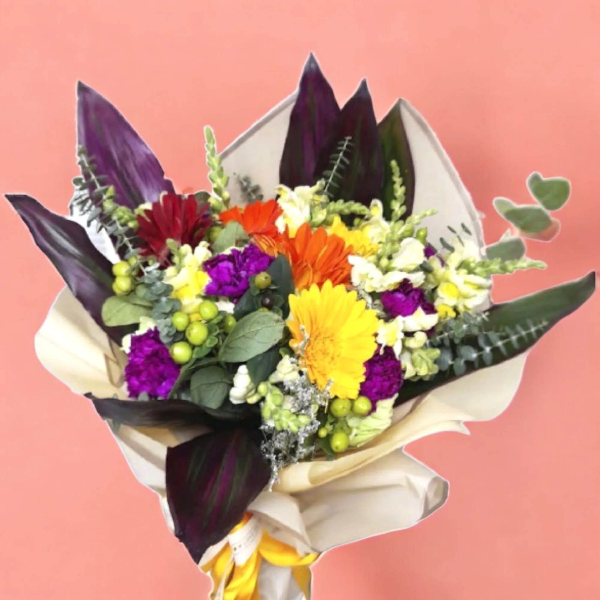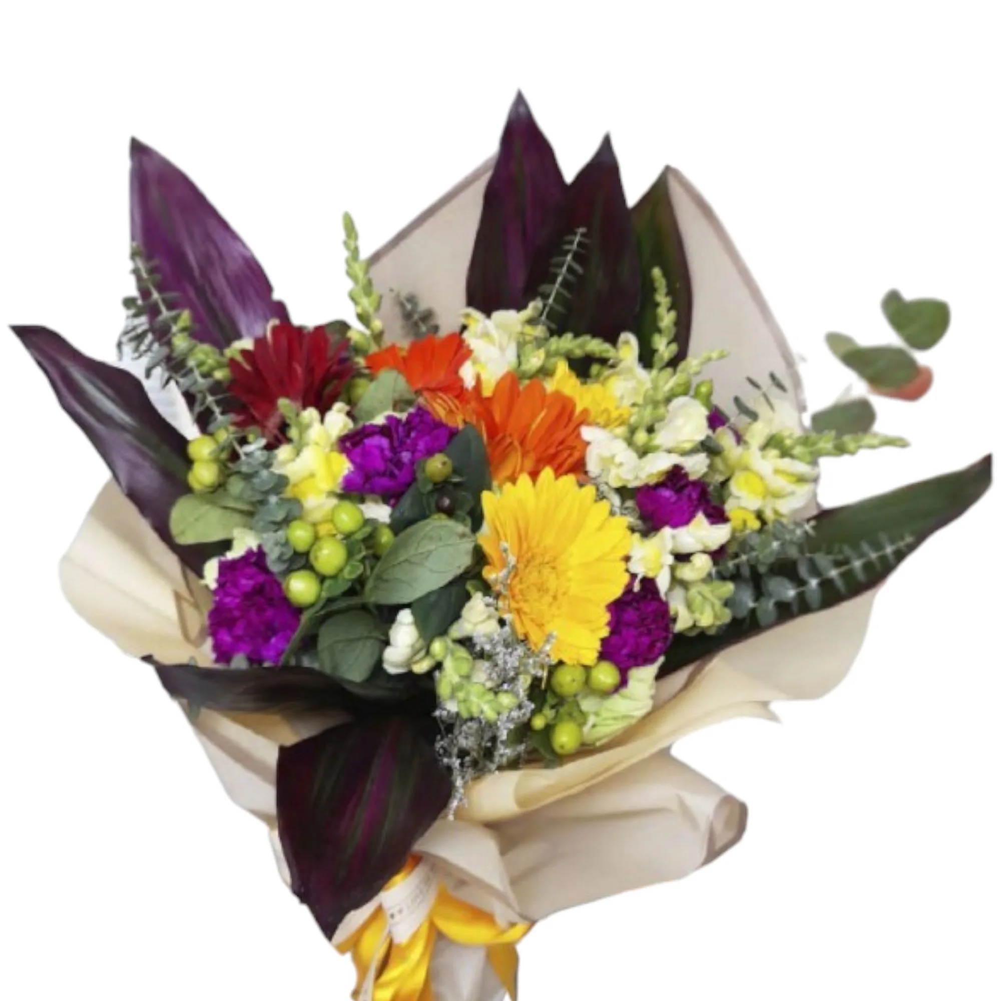 ramillete elaborado en gerberas, boca de dragón, eucalipto, ipérico verde, caspia, hoja de carey, clavellina.