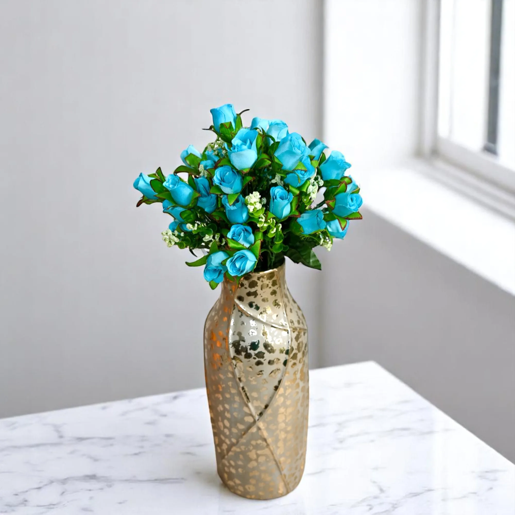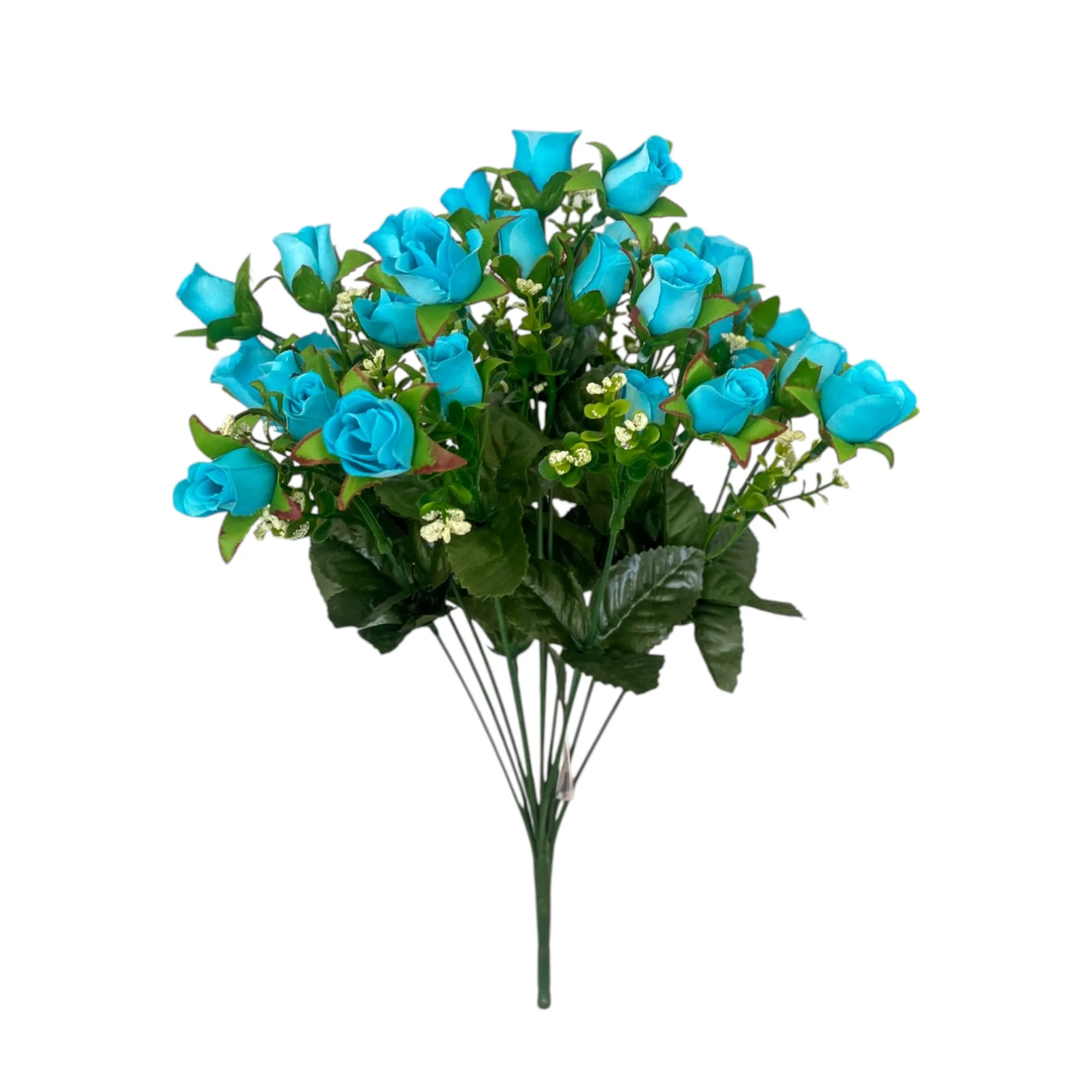 Bonche de rosas azules artificiales con medidas de 43 cm con follaje detallado, perfectas para decoraciones y arreglos elegantes.