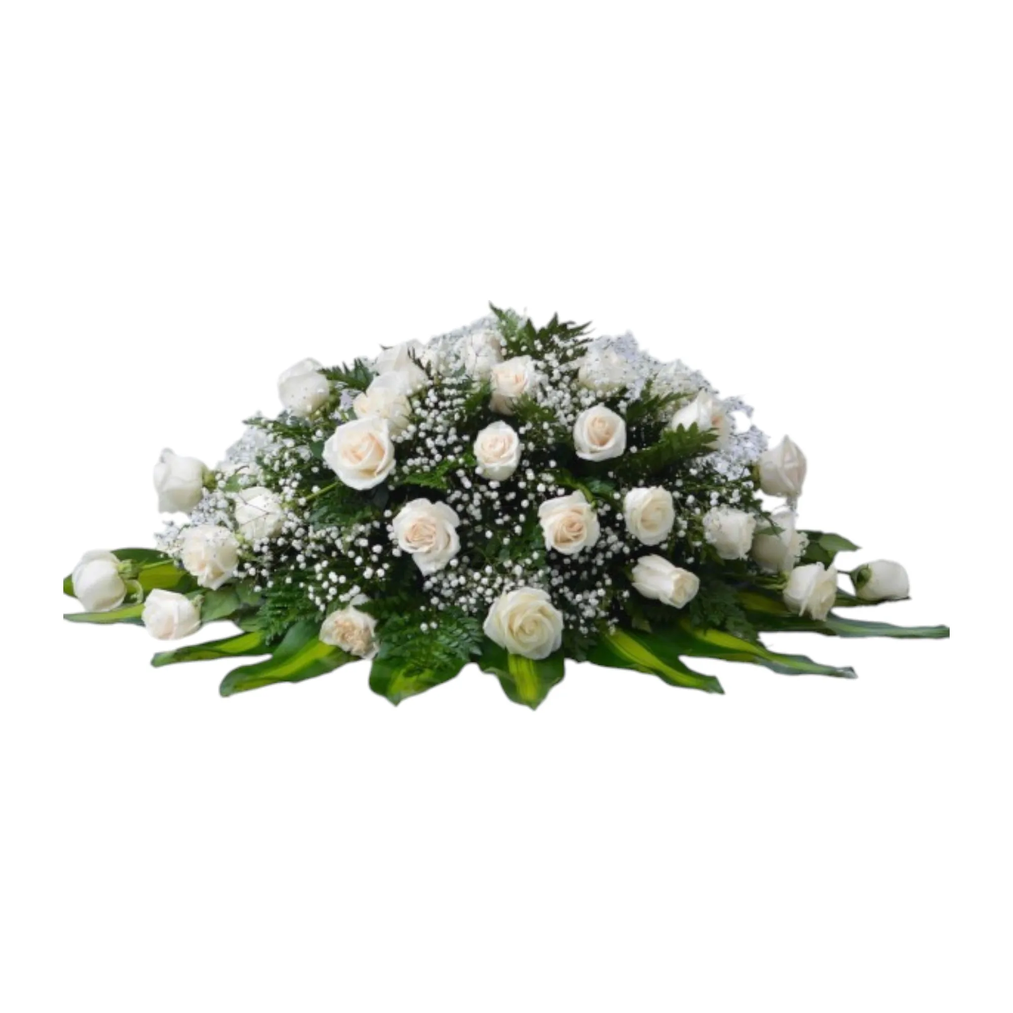 Sudario en rosas blancas con hoja de dracena, helecho cuero y gipsofilia.