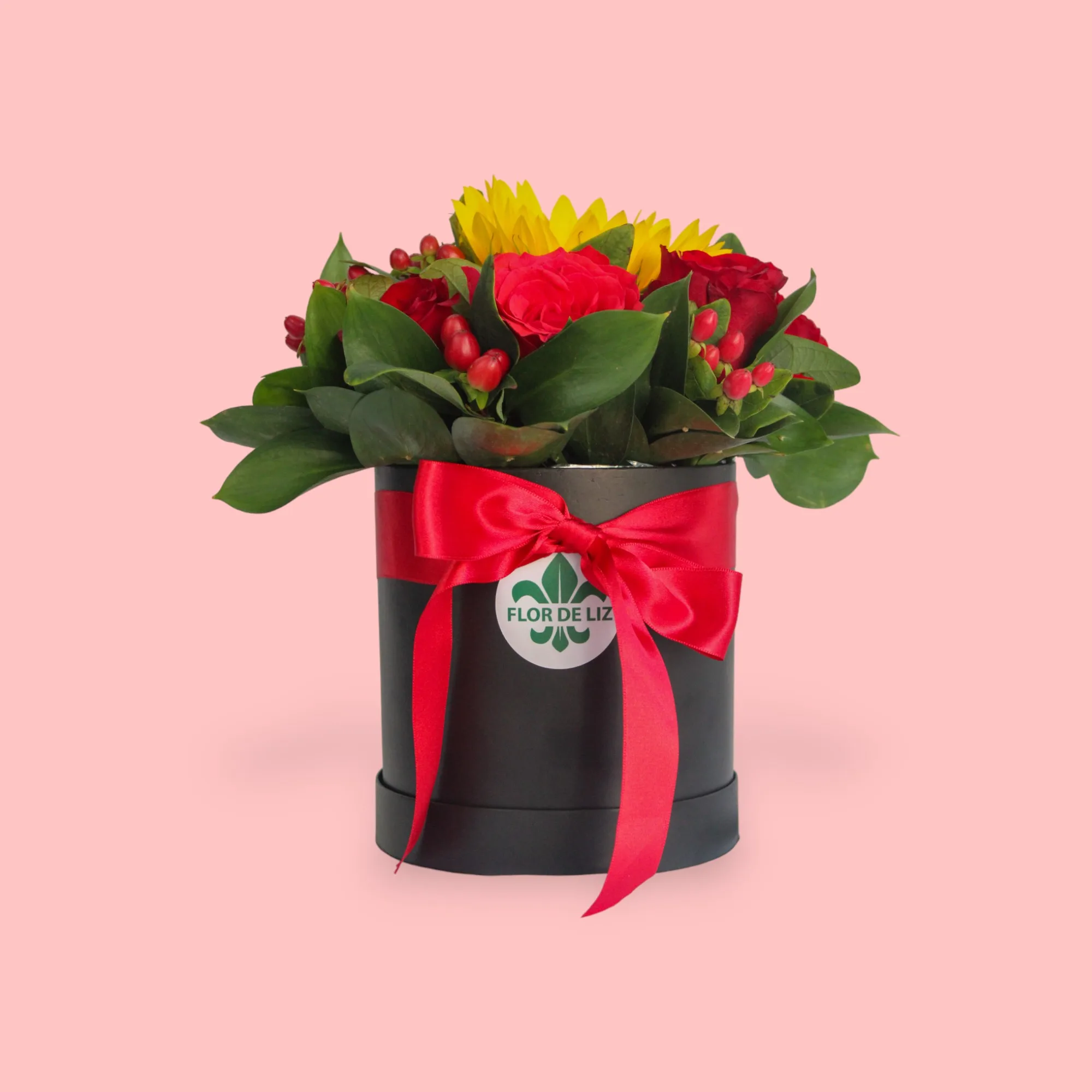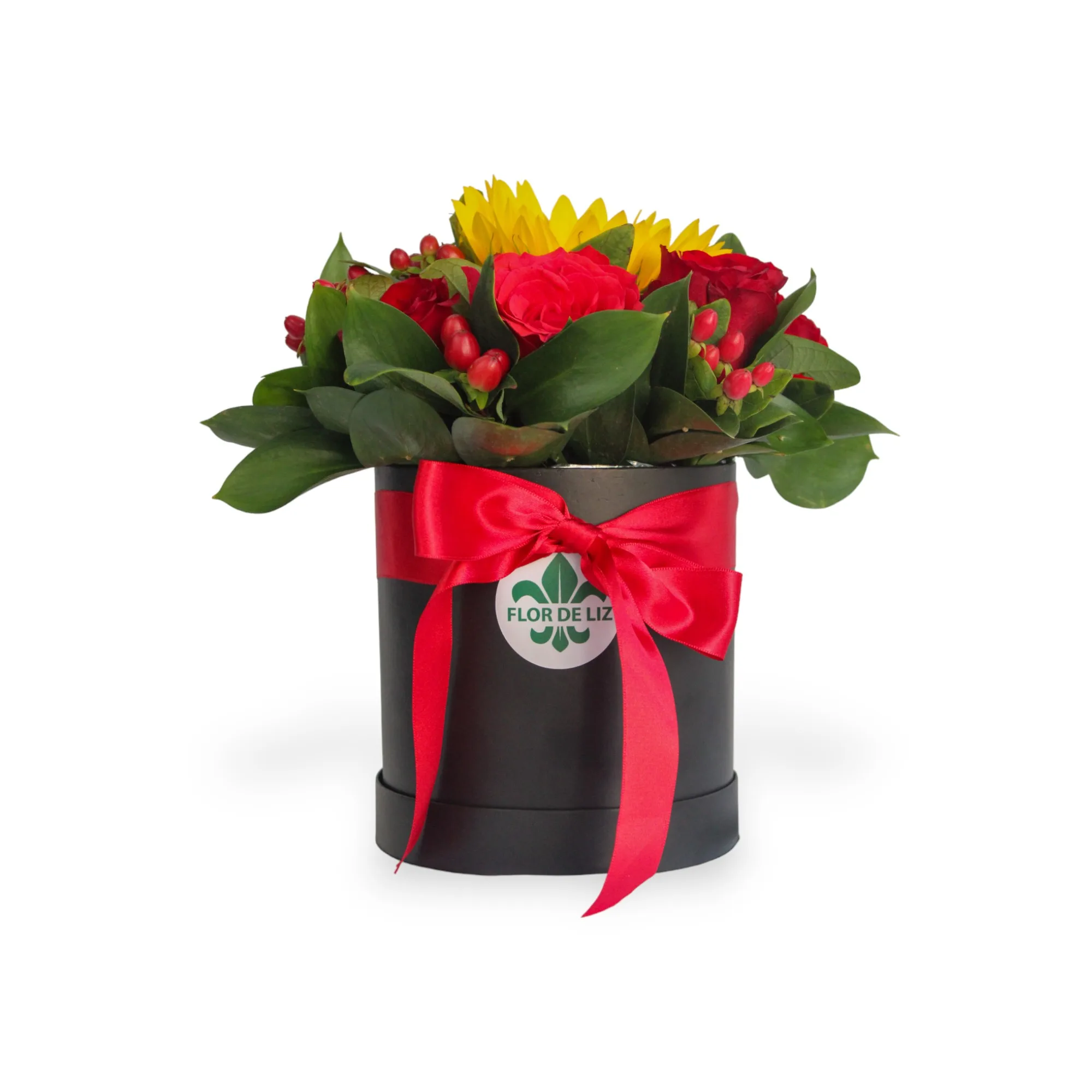 Caja redonda decorada con Girasoles, Rosas, Rusgo y Cafeto, acompañada de un elegante lazo en cinta de tela.