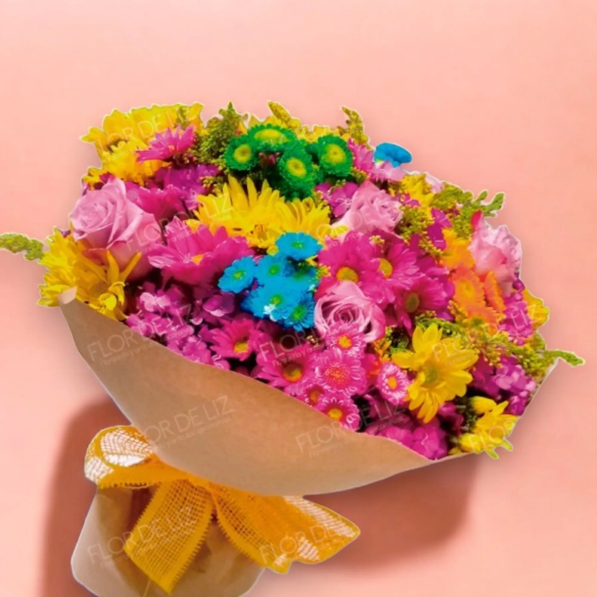 Hecho en flores surtidas naturales, acompañado de follajes, envuelto en papel y lazo en maya delicada.