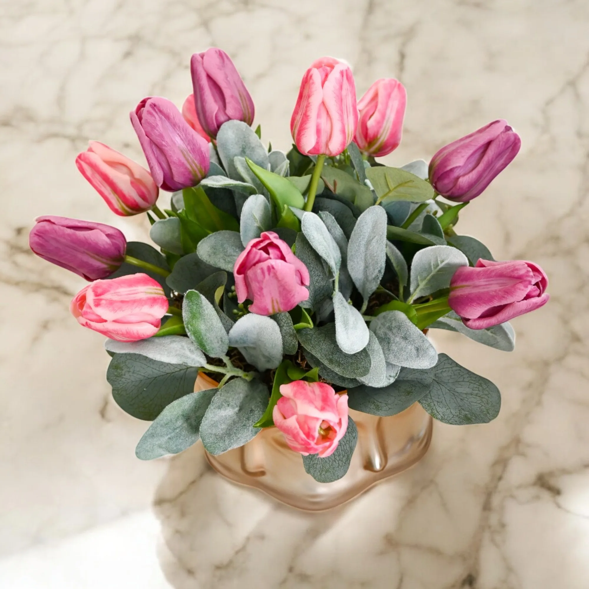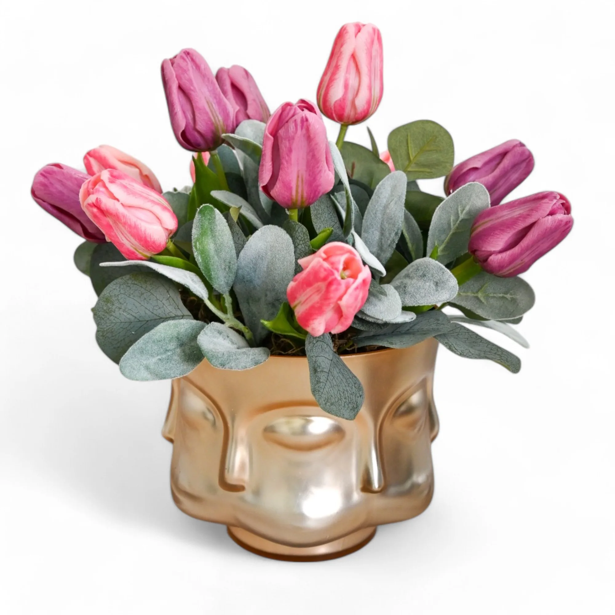 Hermoso arreglo artificial elaborado en tulipanes, eucalitpto y base decorativa.