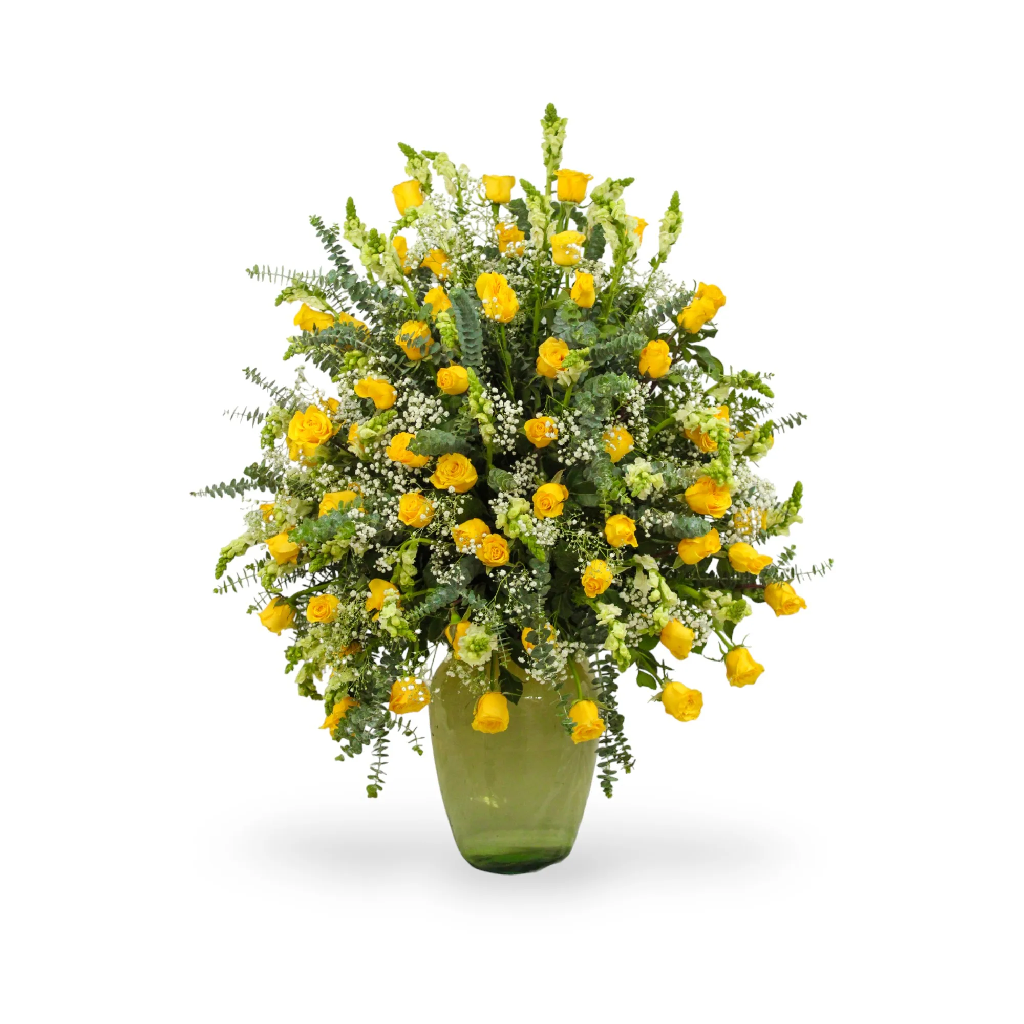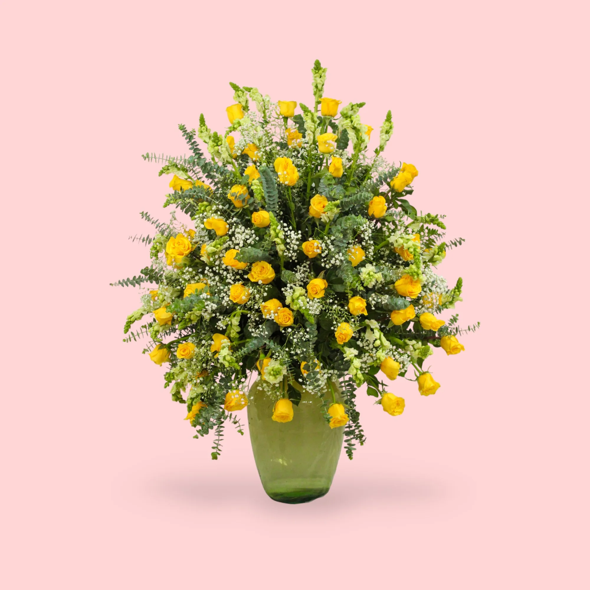 Un regalo que combina estilo y emociones en cada detalle; Las Rosas brillan con el toque de Eucalipto, Boca de dragón y Gipsofila, creando una composición llena de frescura y elegancia.