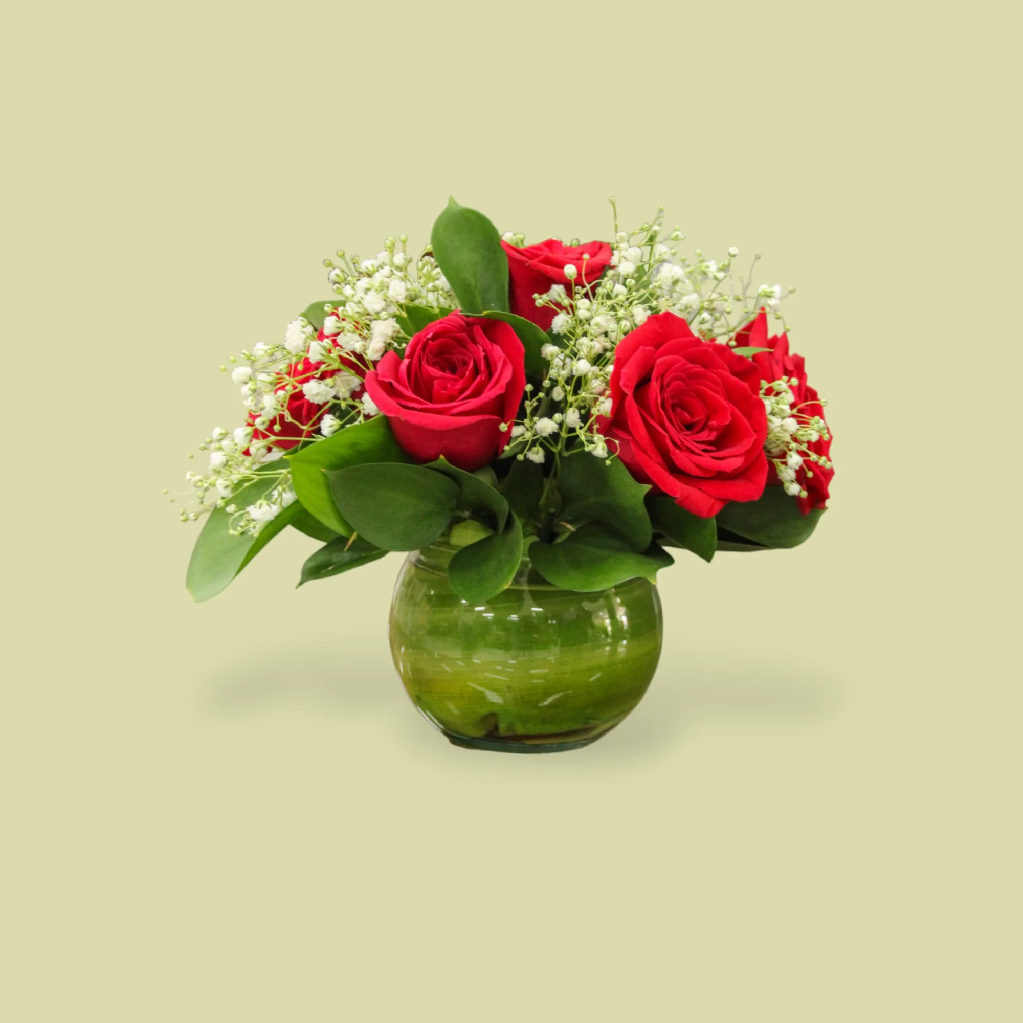 Elegancia y frescura en un solo detalle. Este centro de mesa en Rosas, Gipsofila y Rusgo es la pieza perfecta para cualquier ocasión especial.