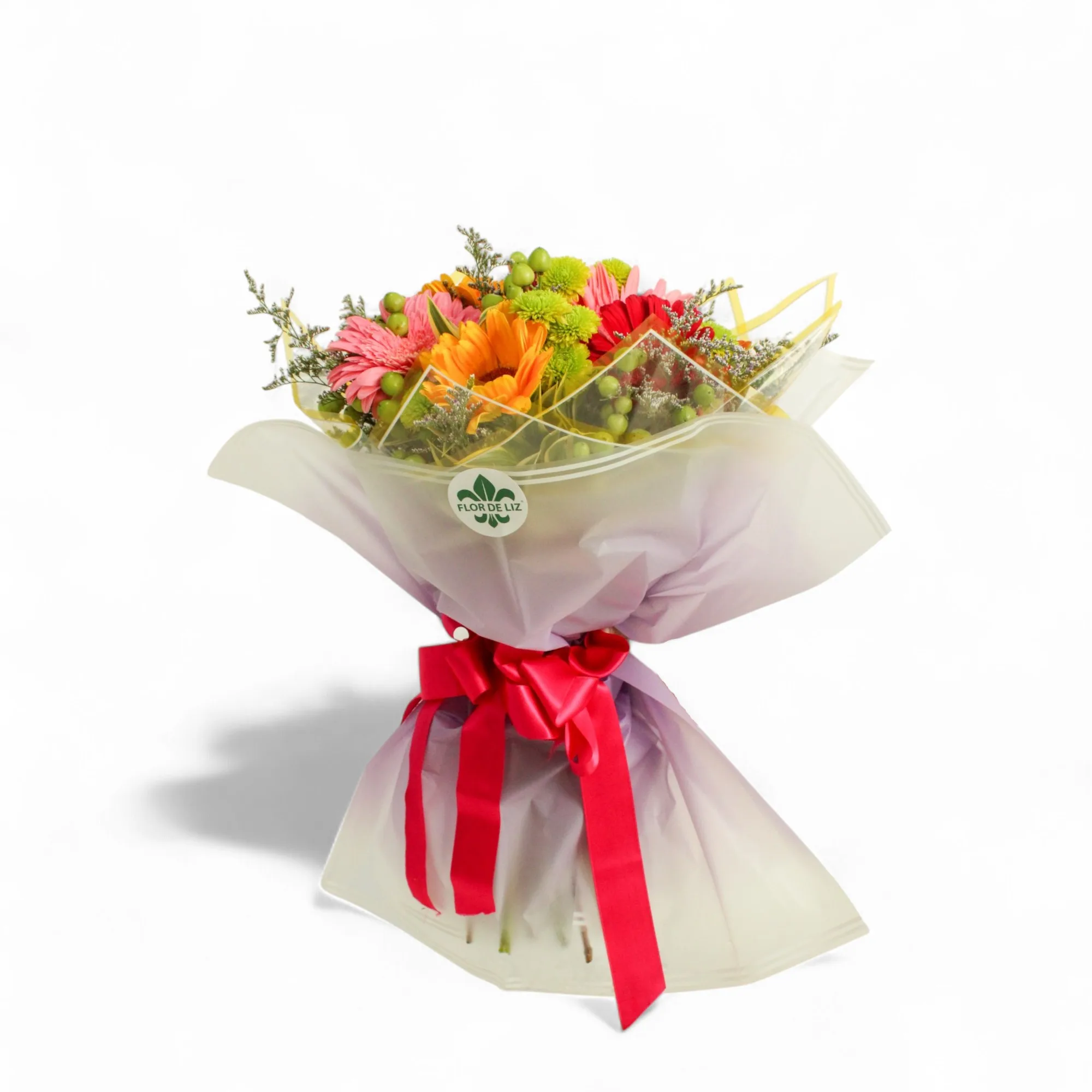 Un ramillete lleno de color y frescura, elaborado con Gerberas surtidas, Pinoquios, Cafeto, Caspia y Canción de la India, envuelto en papel coreano y adornado con un lazo en cinta de raso.
