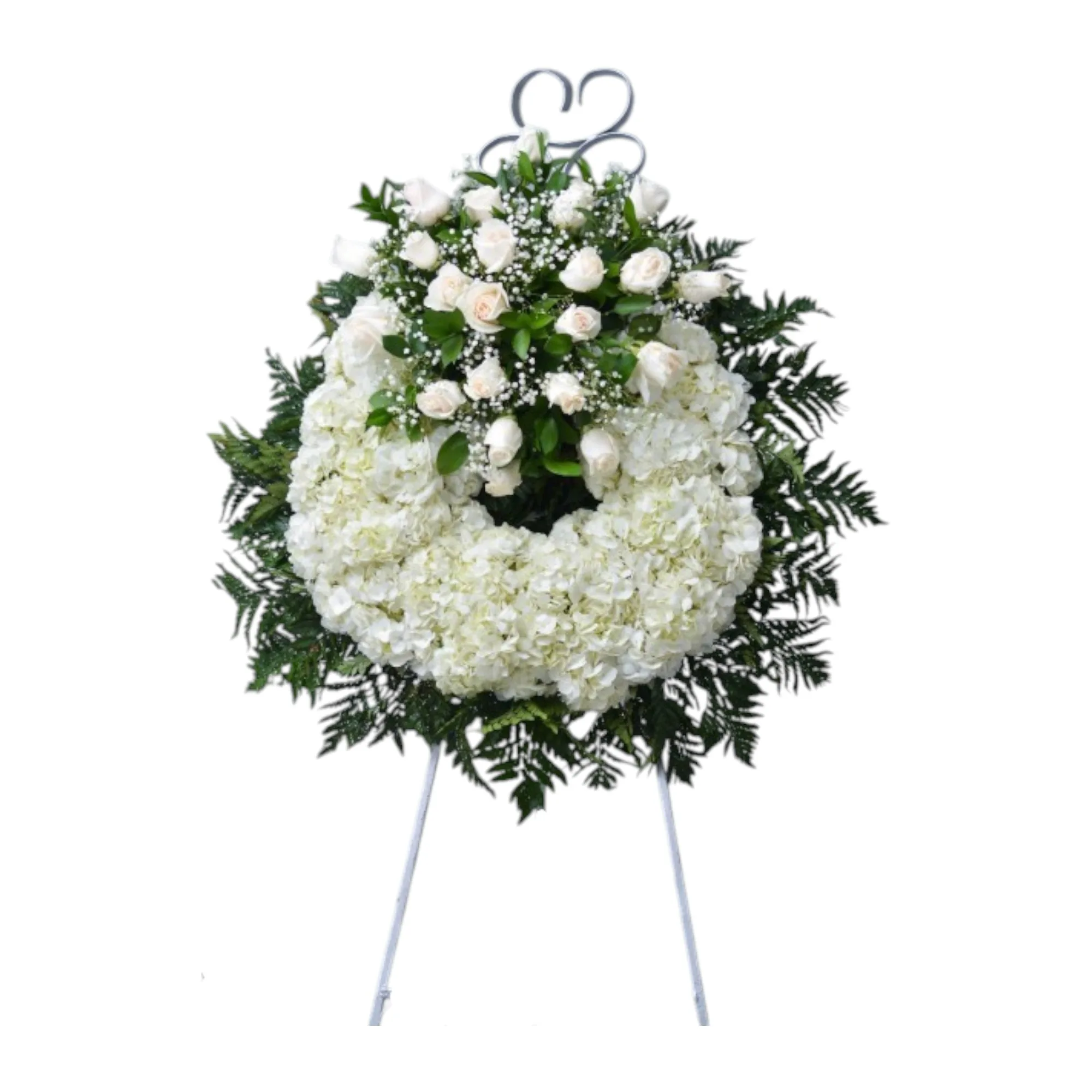 Una corona llena de serenidad y respeto, elaborada con delicadas hortensias y helecho cuero, adornada con las suaves rosas blancas, gipsofila y rusgo.