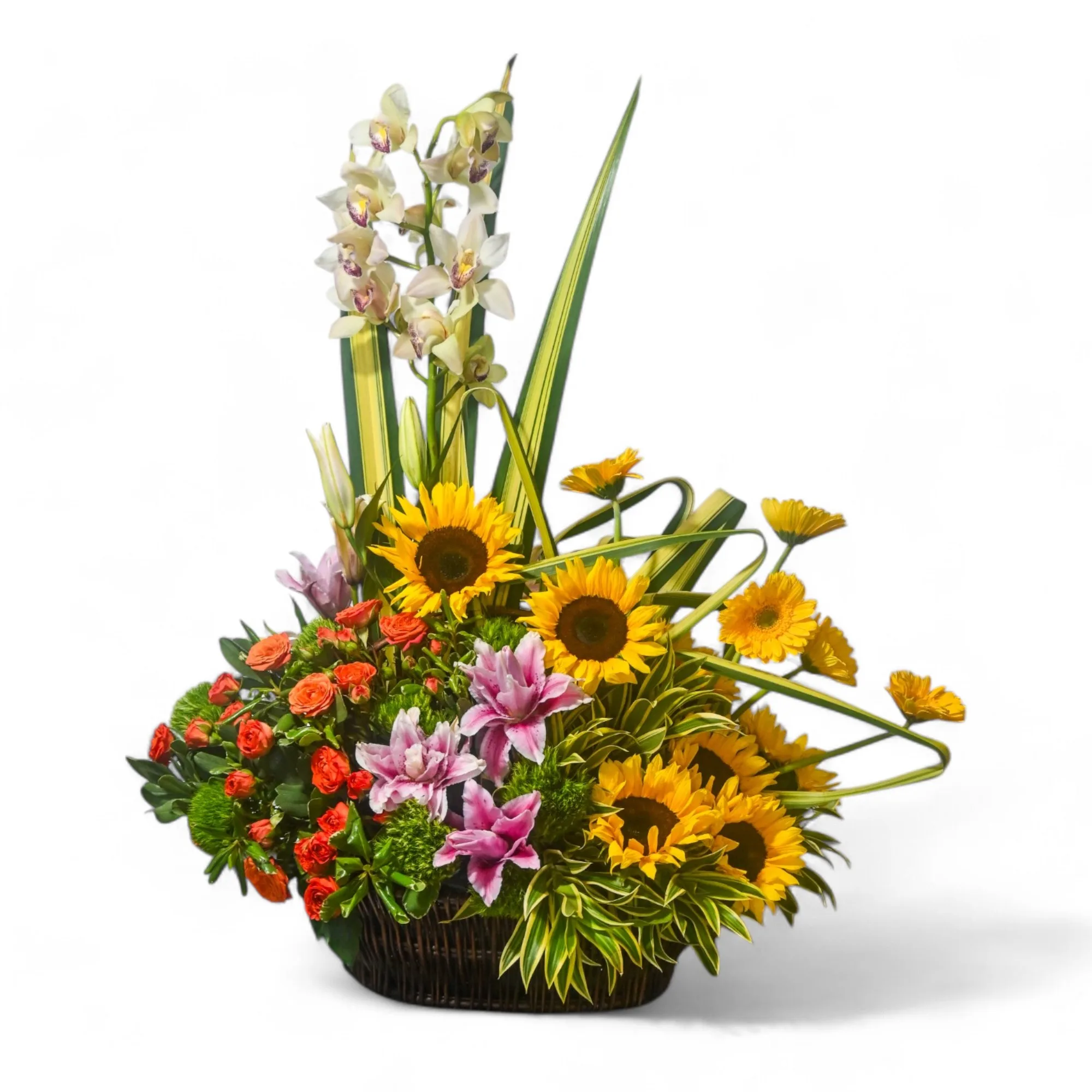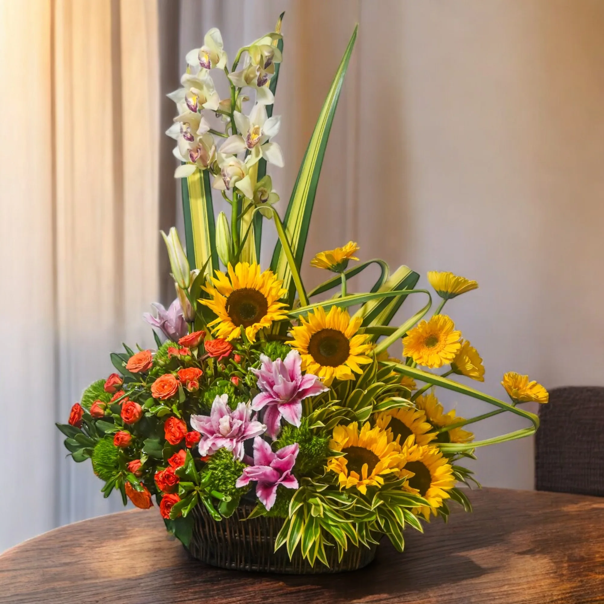 Arreglo redondo elaborado en gorasoles, mini rosas, lirios, gerberas, orquideas, greenball, hoja lino y cancion de la india