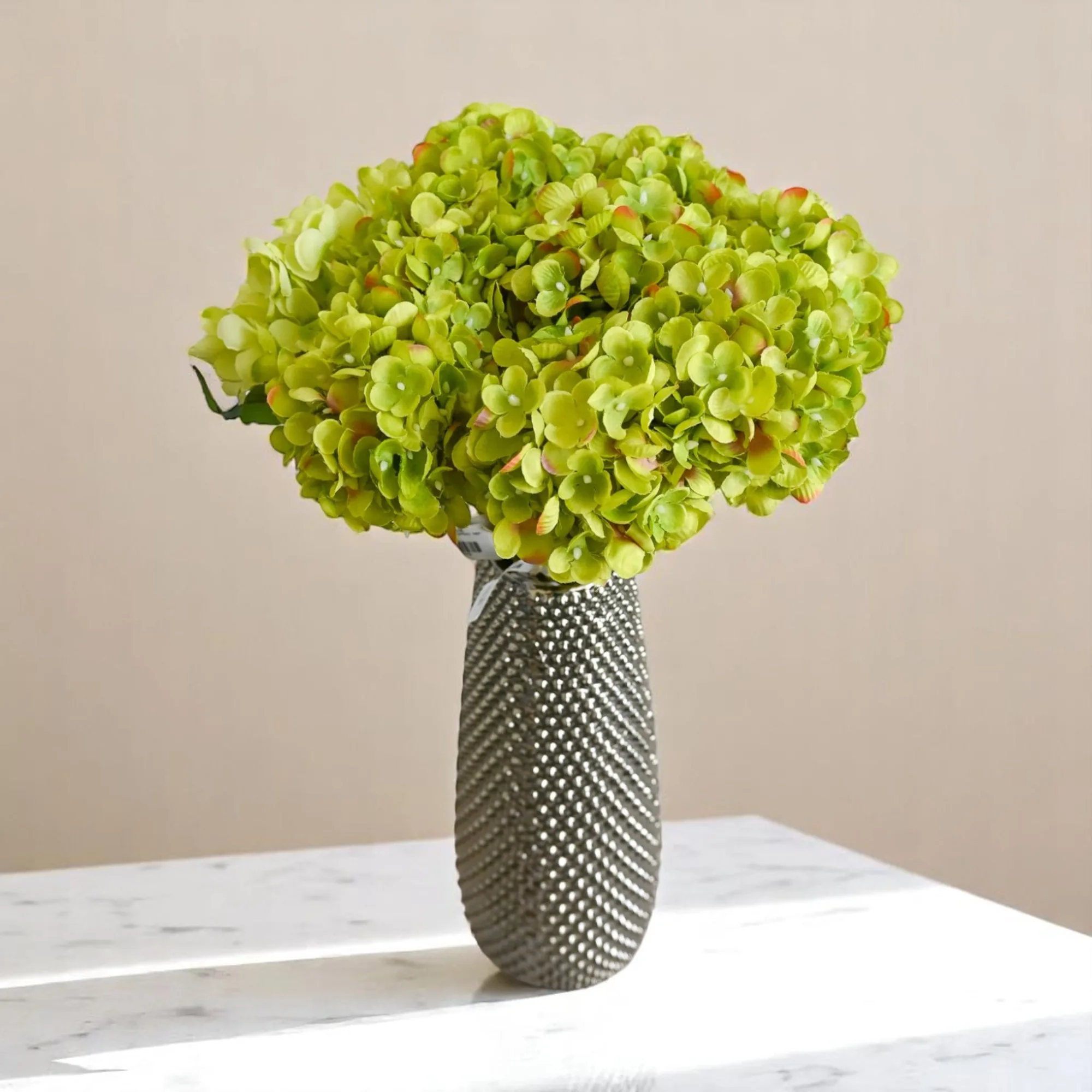 Hortensia artificial verde de 58 cm. Frescura y estilo en una flor que nunca pierde su encanto.
