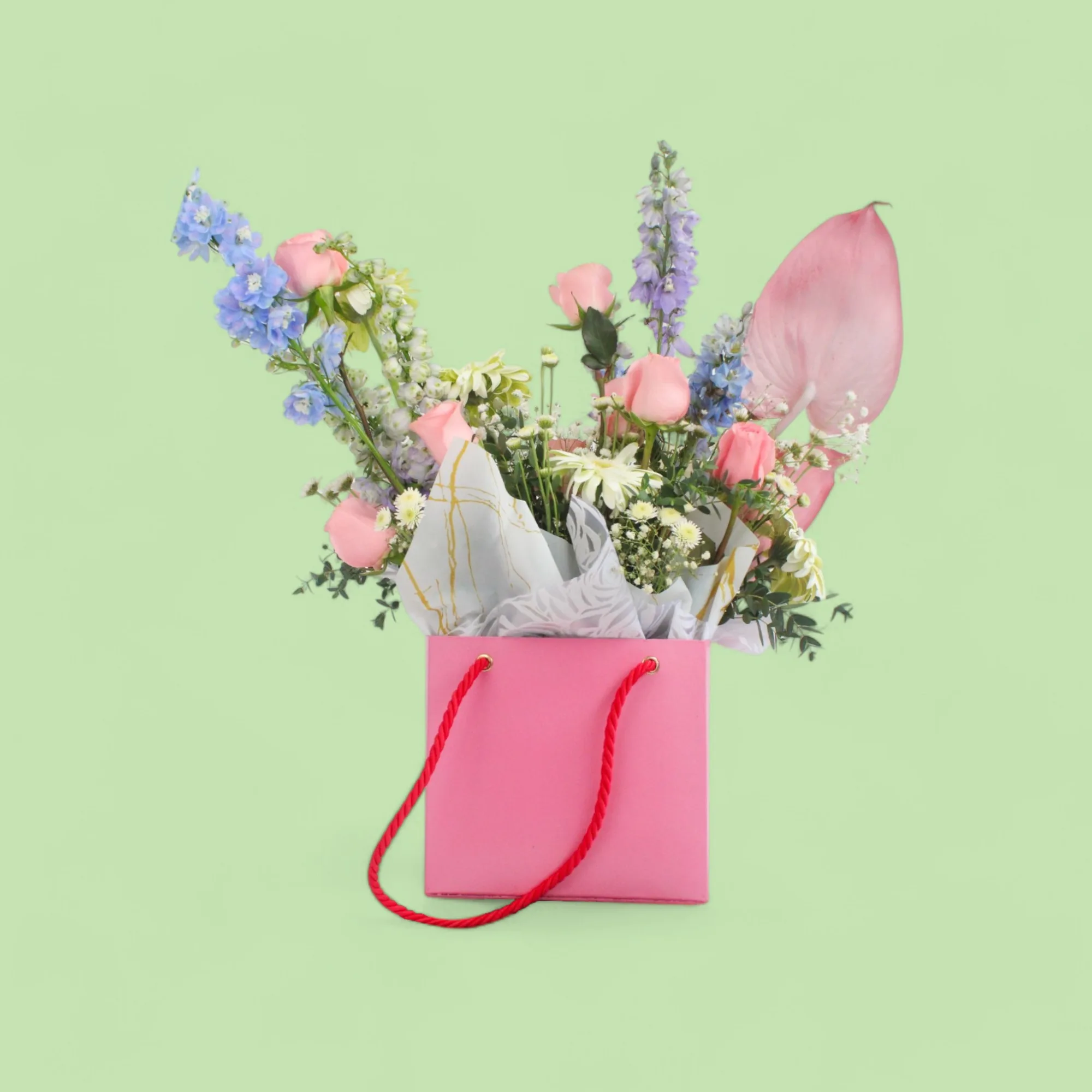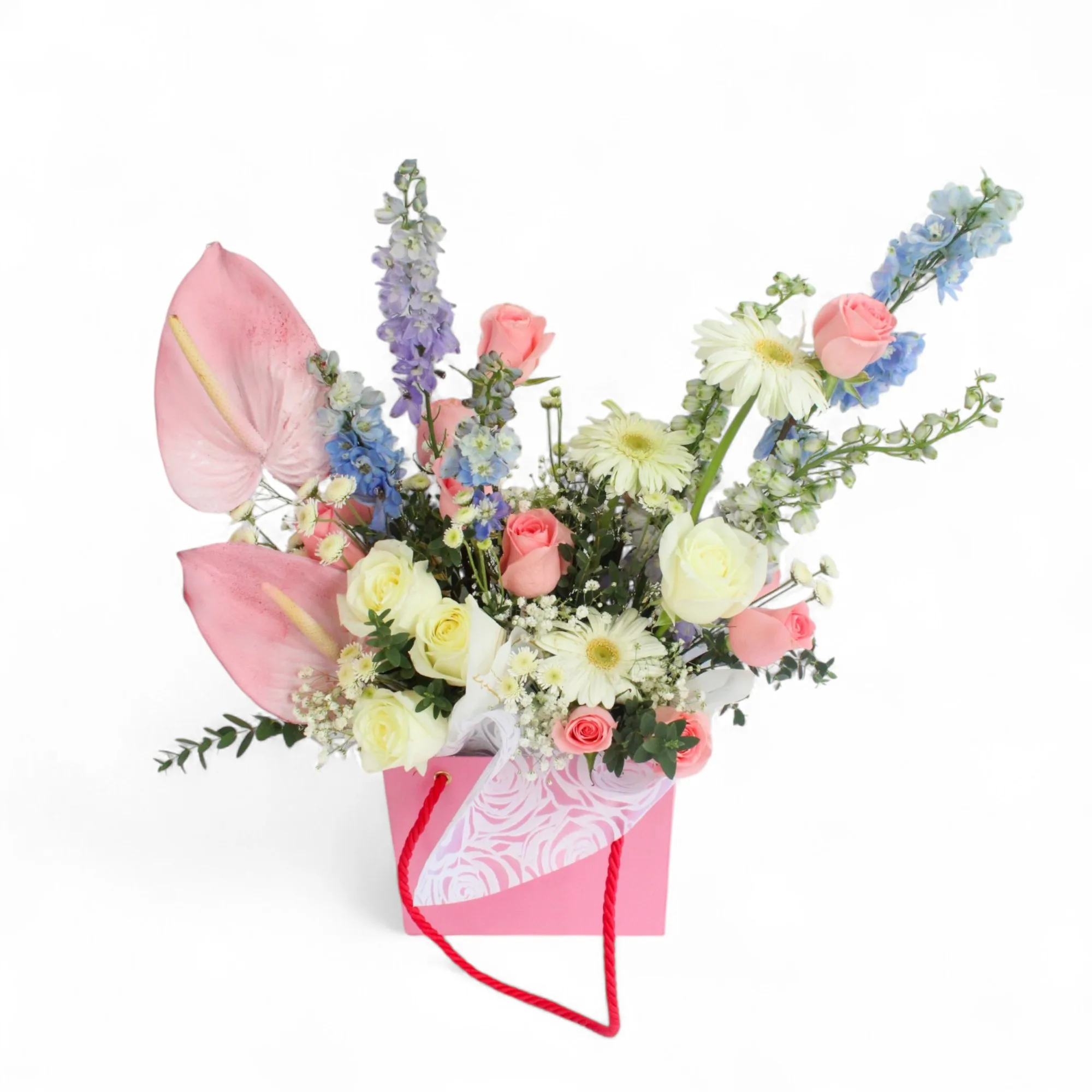 Encantadora cartera en tonos pastel elaboradan en rosas rosadas, gerberas blancas, anturio rosado, delfinios azules y morados, gipsofilia, eucalipto, papel coreano con detalles dorados.
